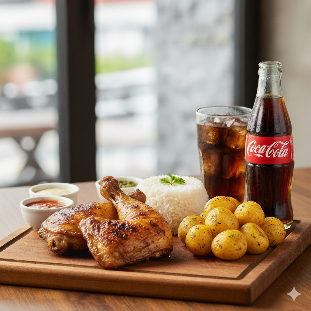 Muslo y Contramuslo, papas a la francesa, salsas al gusto y Coca-Cola 400 ml.