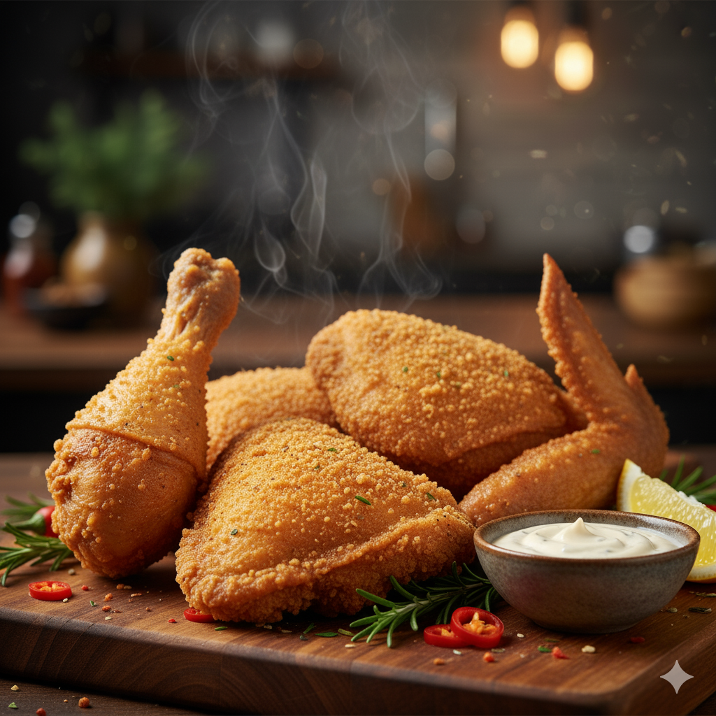 Medio pollo apanado incluye 1 muslo, 2 contramuslos, 1 ala y papa francesa con salas al gusto