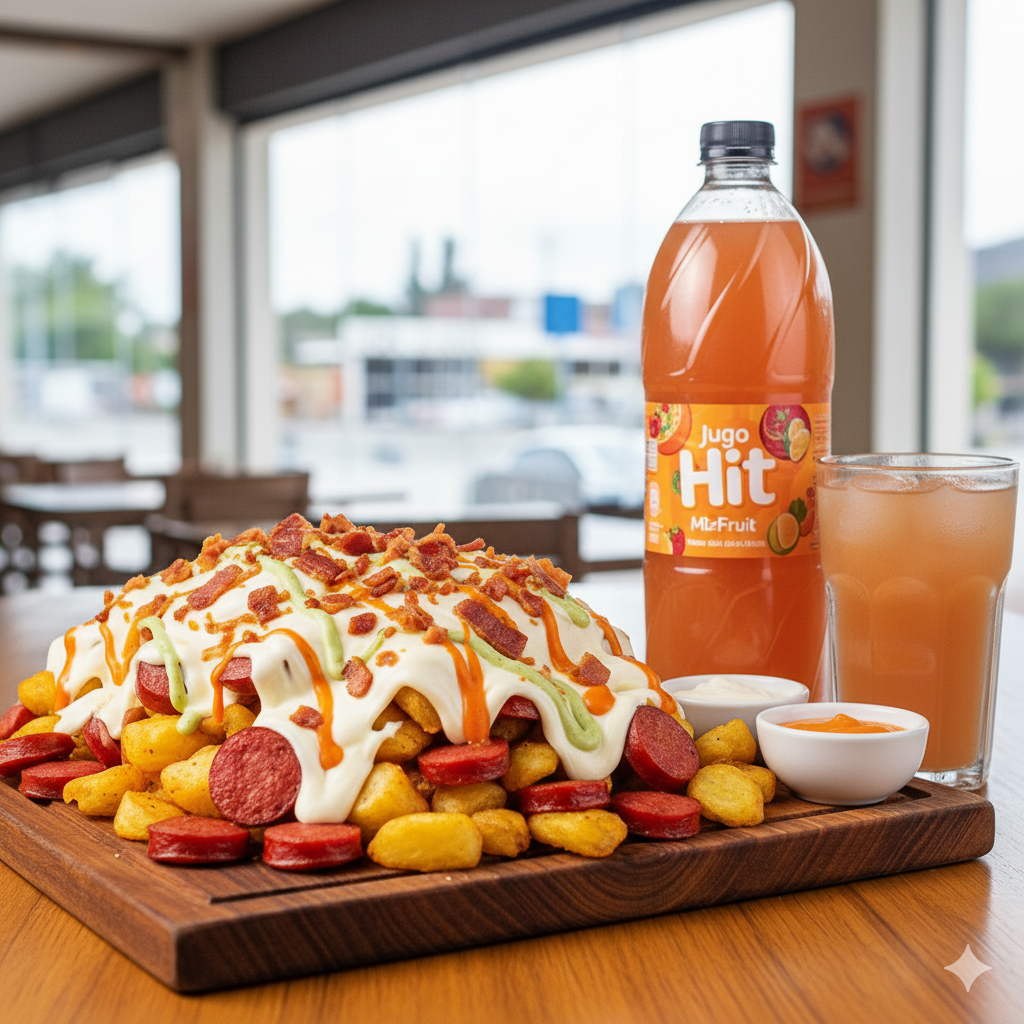 Salchicha, papa, ripio, 2 lonchas de queso, tocineta, salsas al gusto y postobon Litro