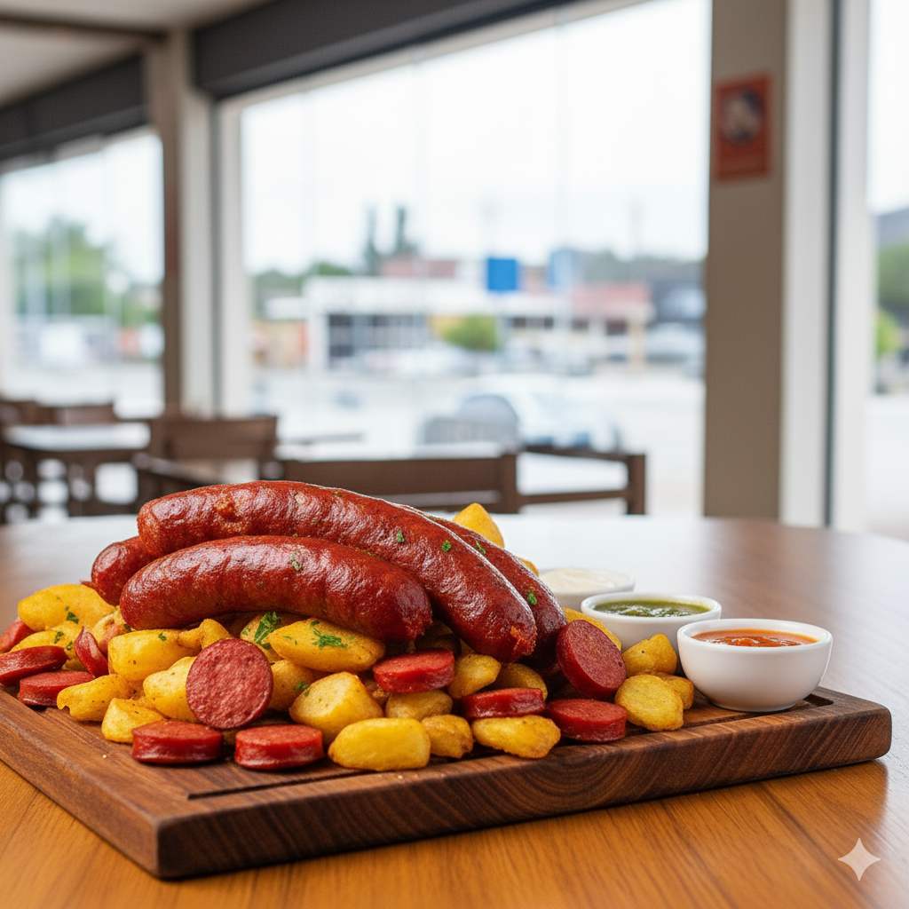 Un chorizo santarosano, papa y salsas al gusto.