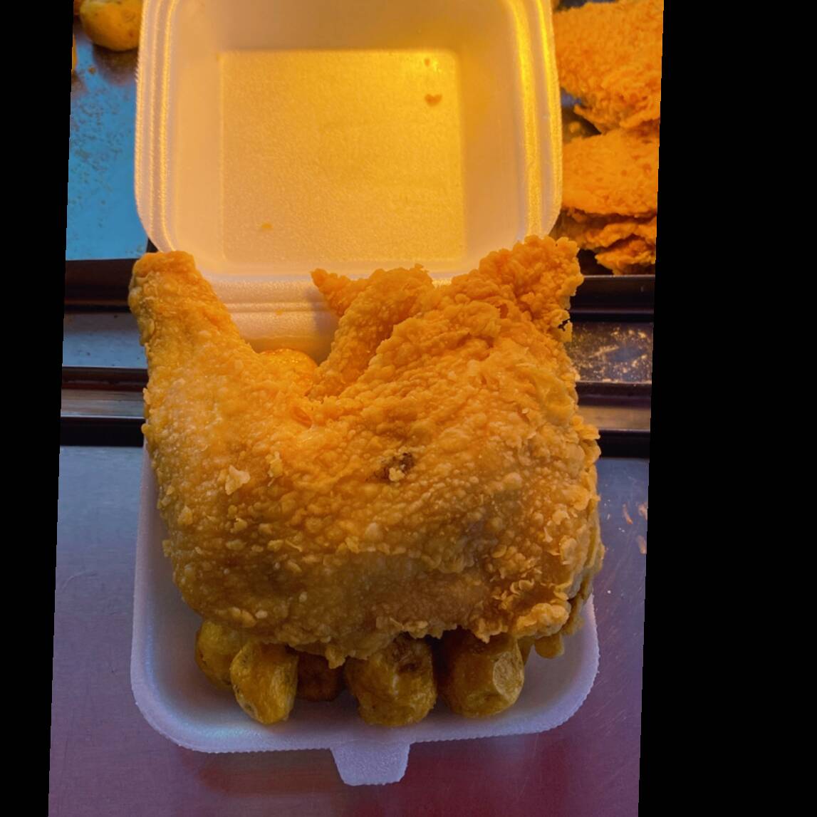 Medio pollo apanado incluye 1 muslo, 2 contramuslos y 1 ala(o muslo) acompañado de papa francesa, salsas con gaseosa litro a eleccion