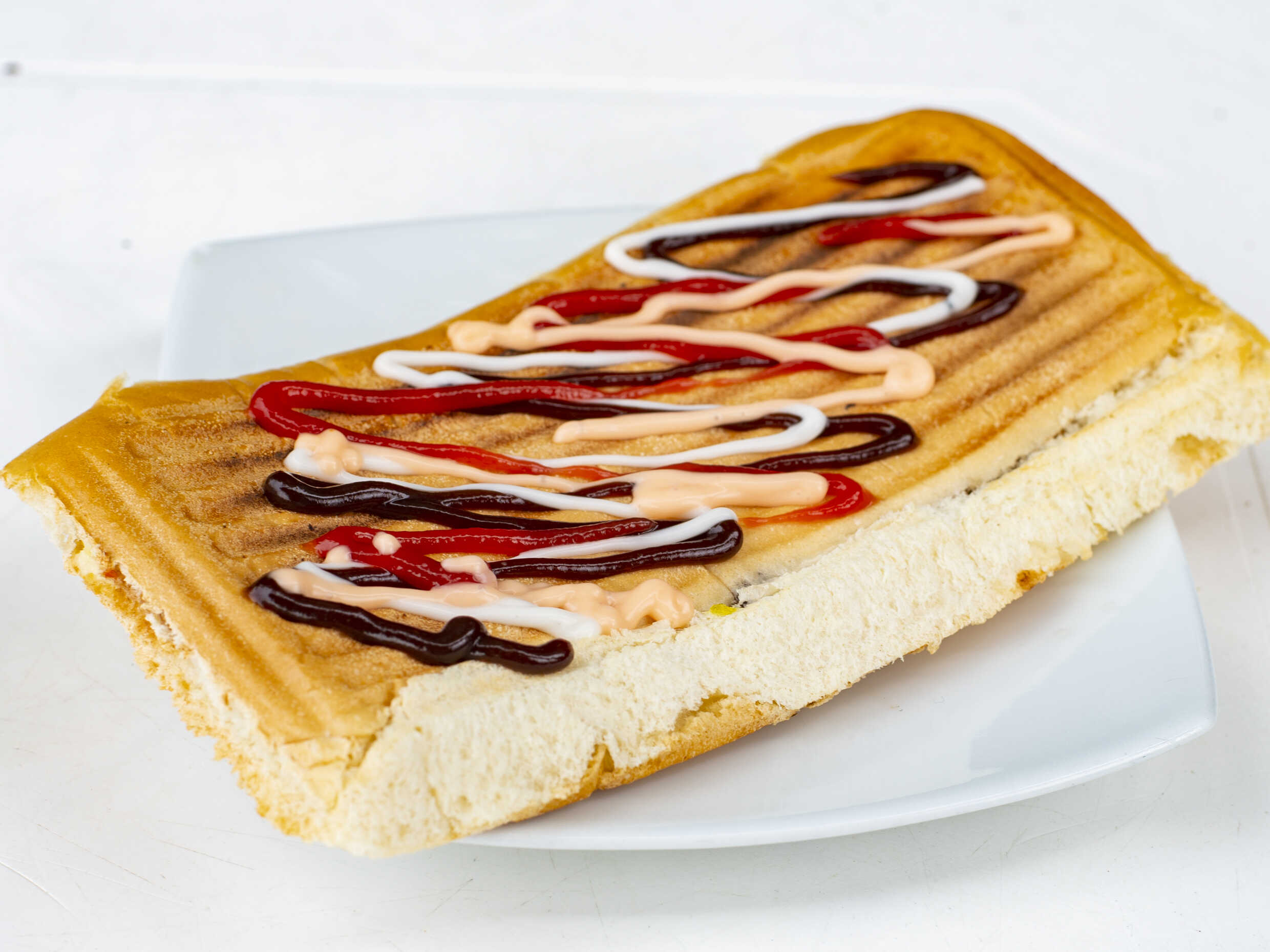 Pan, jamón, lechuga, tomate, ripio de papa, salsa de la casa.
