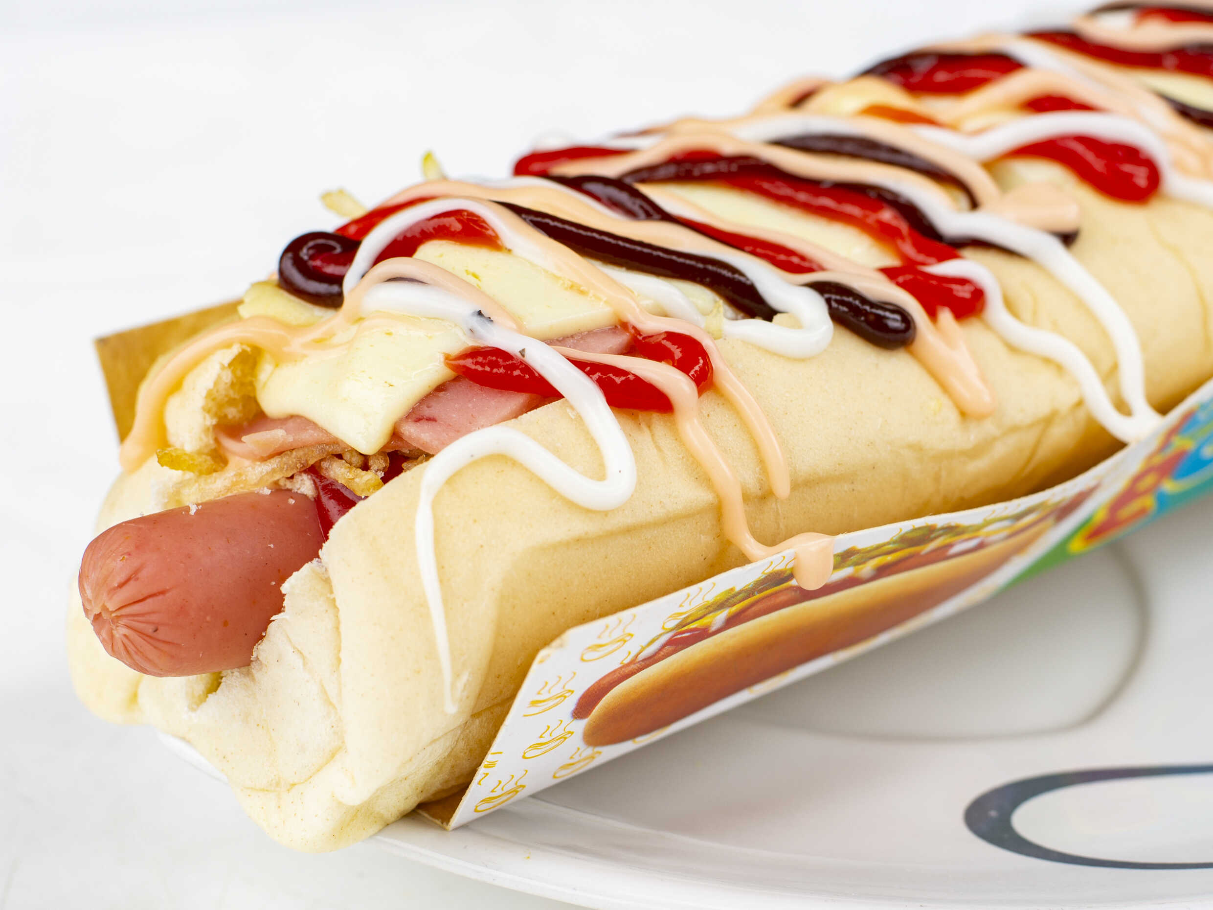 Pan, salchicha, queso, ripio de papa, salsa de la casa.