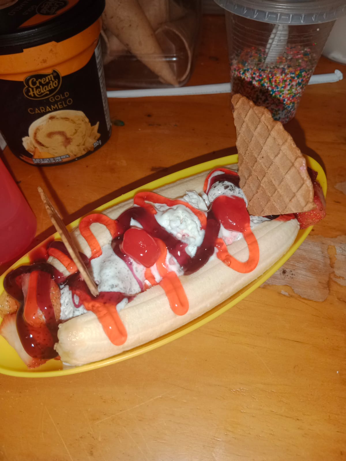 Banano, tres bolas de helado, ciruelas, galletas y salsa.