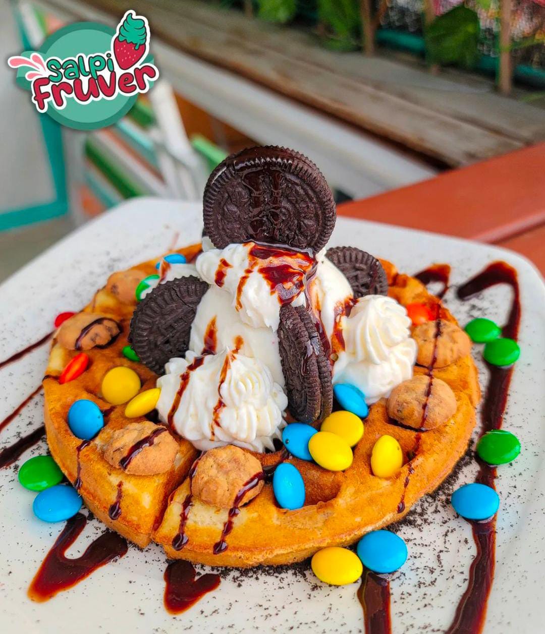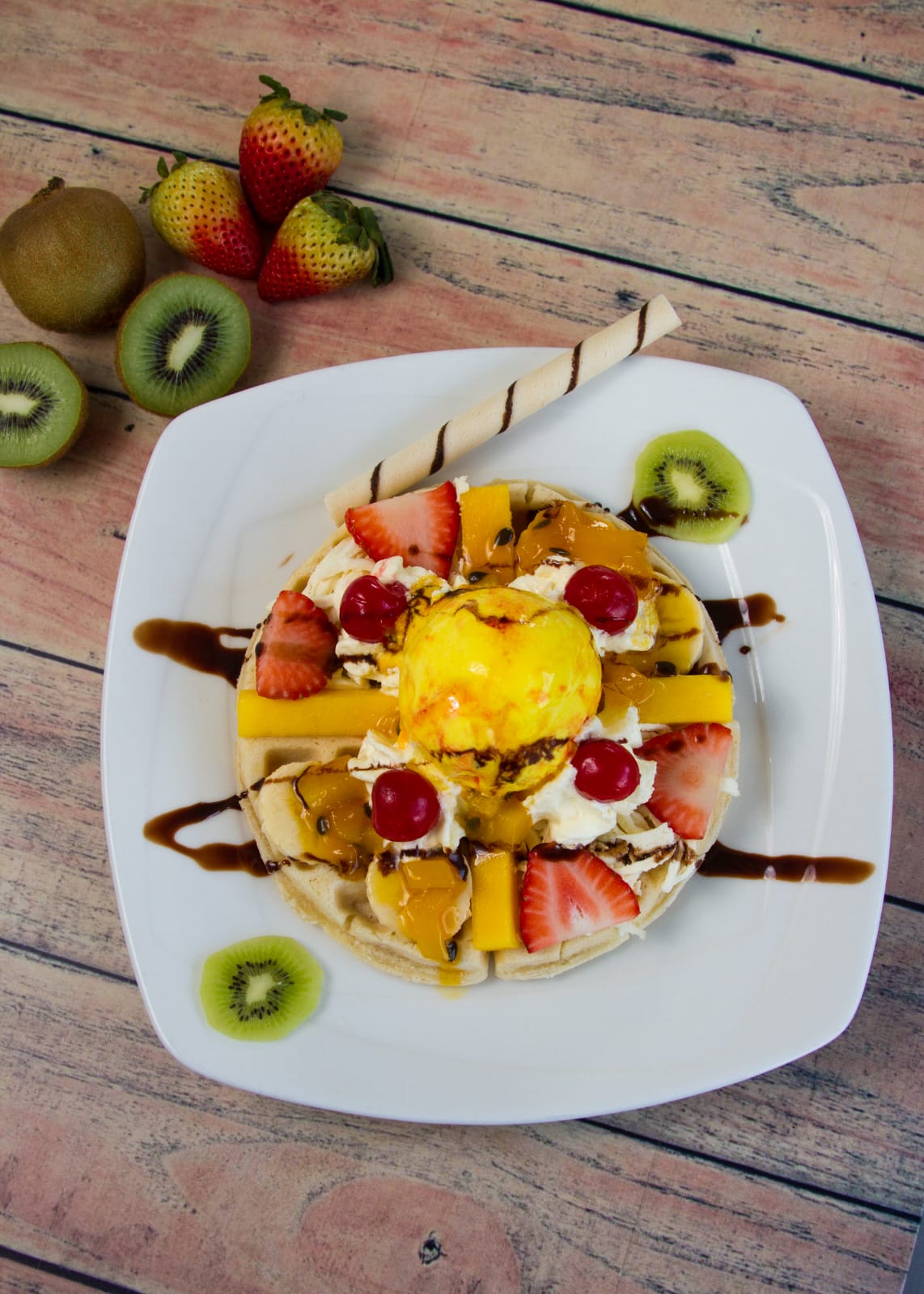 Queso campesino, crema shantilly, waffle, bola de helado, fresa, banano, manzana y salsas