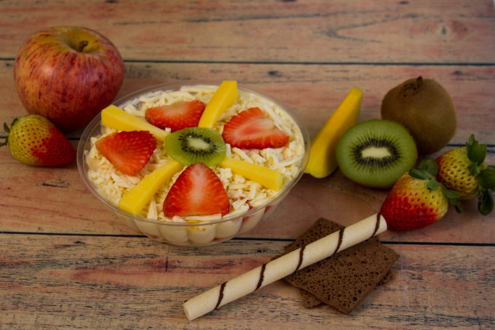 crema de leche, queso campesino, banano, mango, papaya, manzana, fresa, kiwi, galleta, 32 oz
