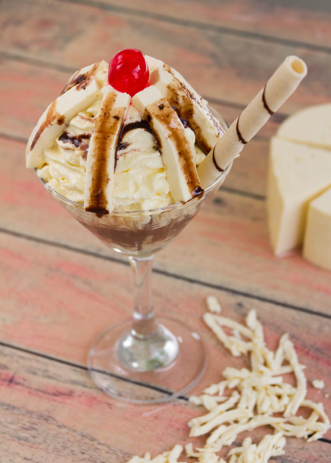 tres bolas de helado base de fruta, crema de leche, queso campesino cerezas y salsas 24 onzas