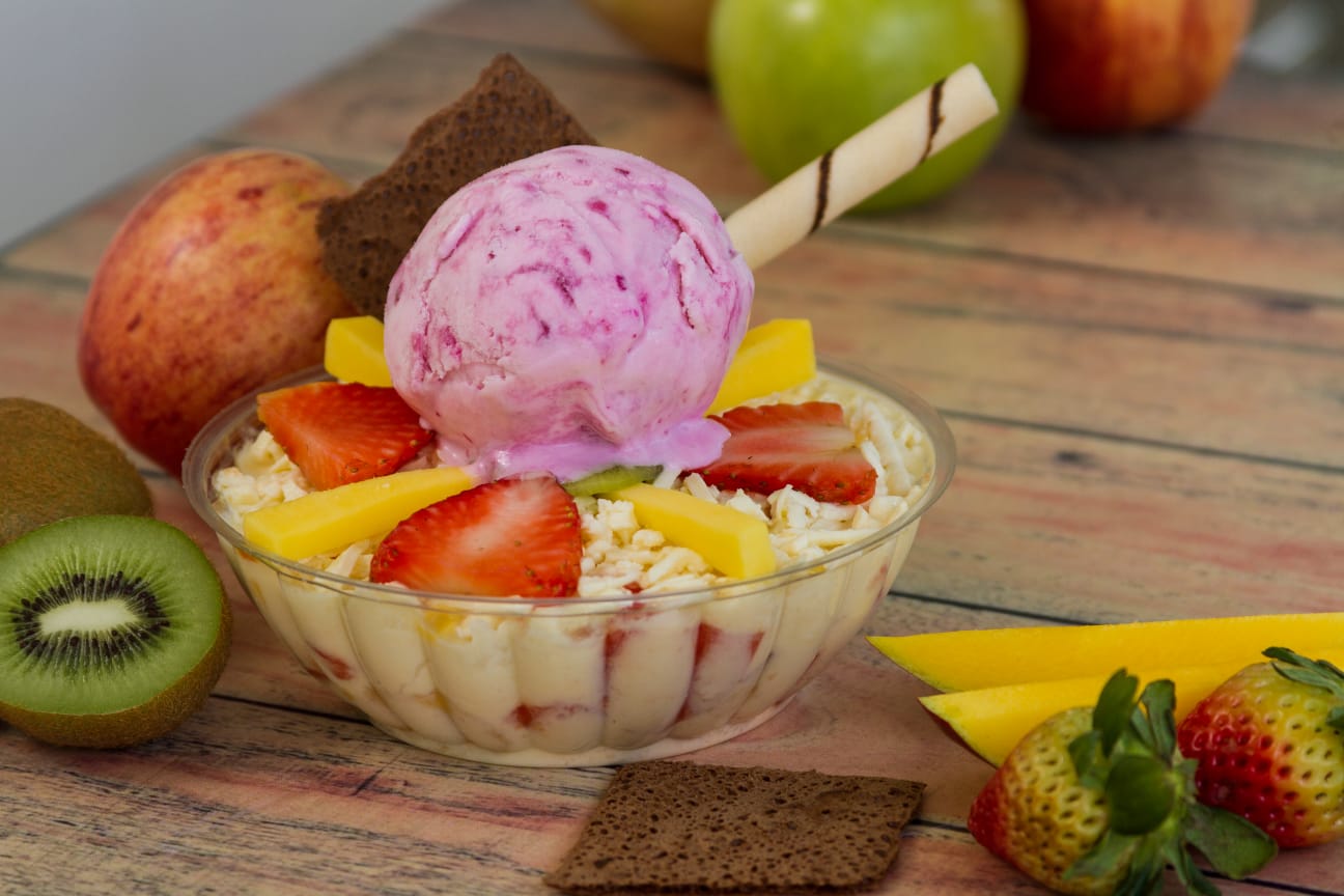 Incluye dos bolas de helado, crema de leche, queso campesino, banano, mango, papaya, manzana, fresa, kiwi y galleta. Incluye aderezo a elección (mora, maracumango o leche condensada). Tamaño 32 onzas.32onzas