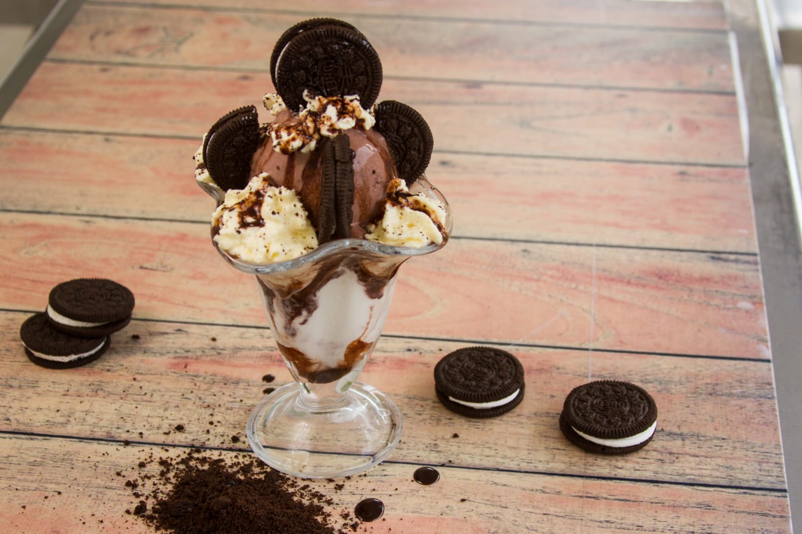Dos bolas de helado, crema Shantlly, salsa de chocolate y galleta oreo
