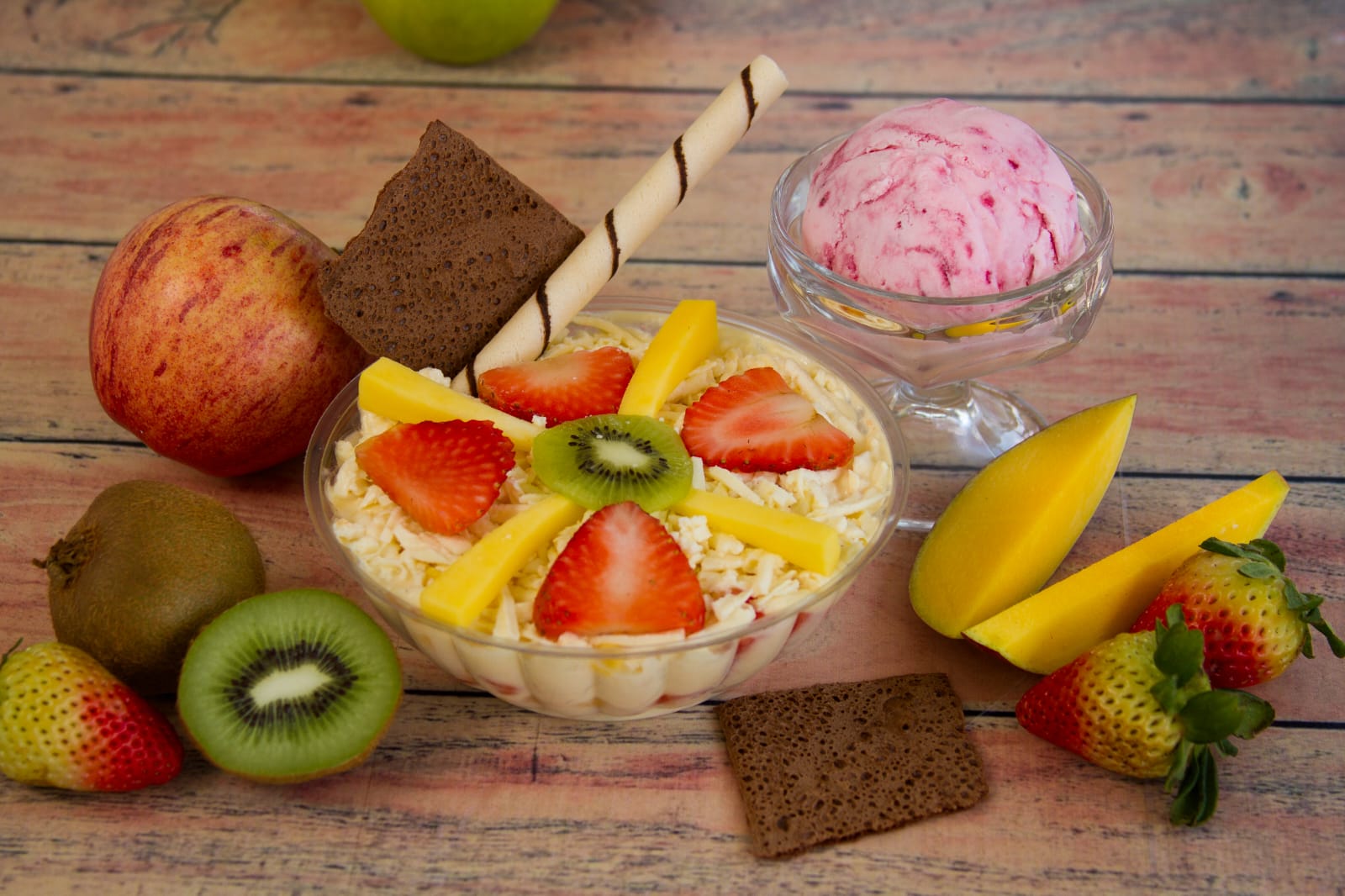 Dos bolas de helado, creps, fresa, banano, kiwi, crema de shatilly, mango manzana, queso y salsa