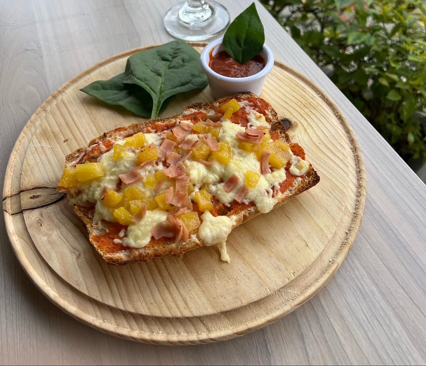 Tostada de pan europeo con salsa napolitana cubierto de queso mozzarella y el sabor de tu elección.