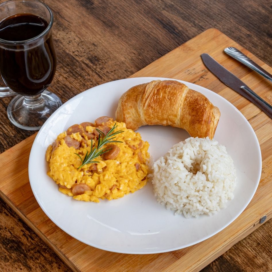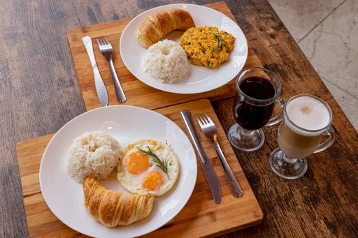 2 Huevos a elección con arroz, croissant y 2 bebidas a elección.