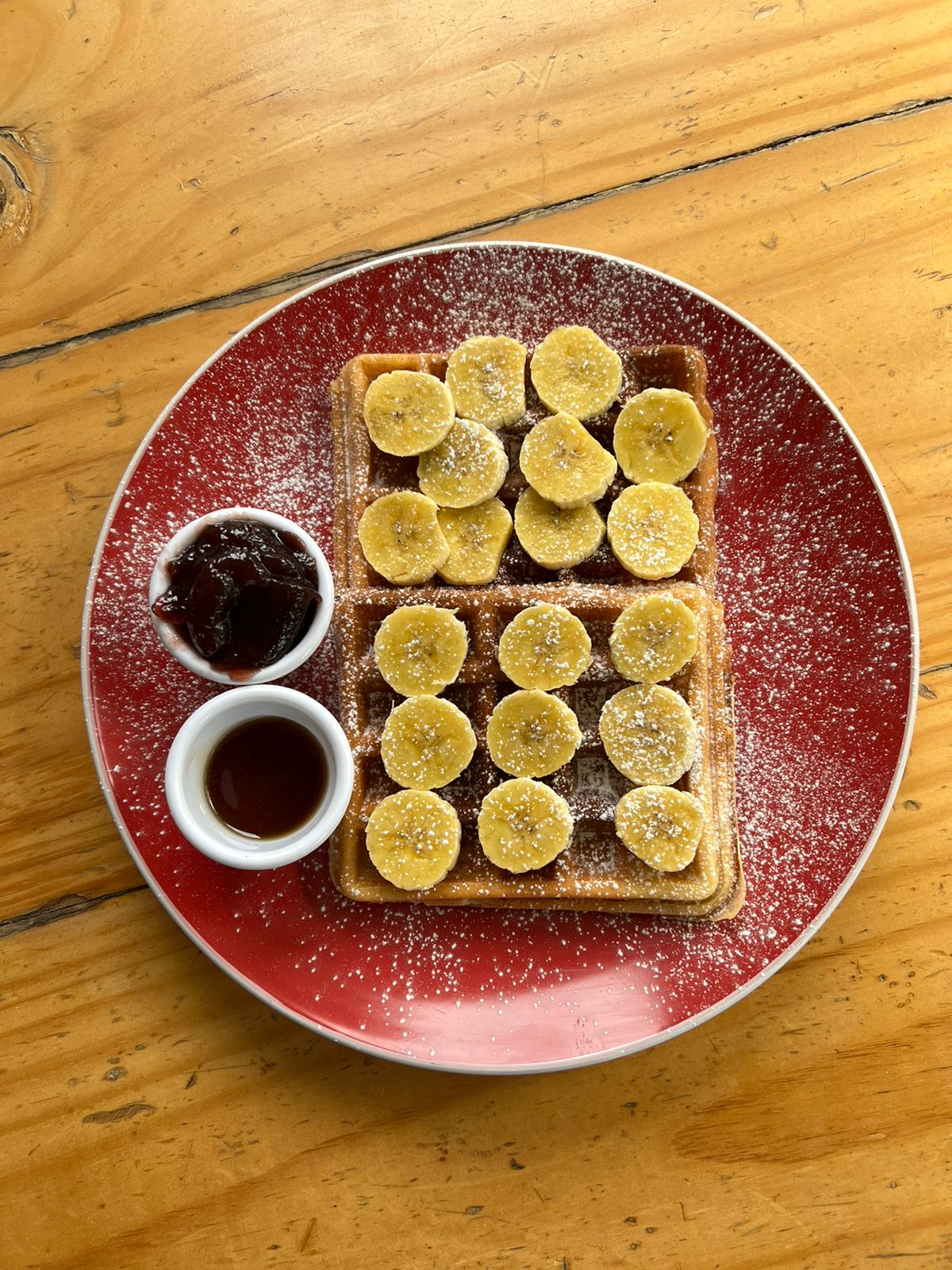 Waffles acompañados de banano, mermelada y miel.