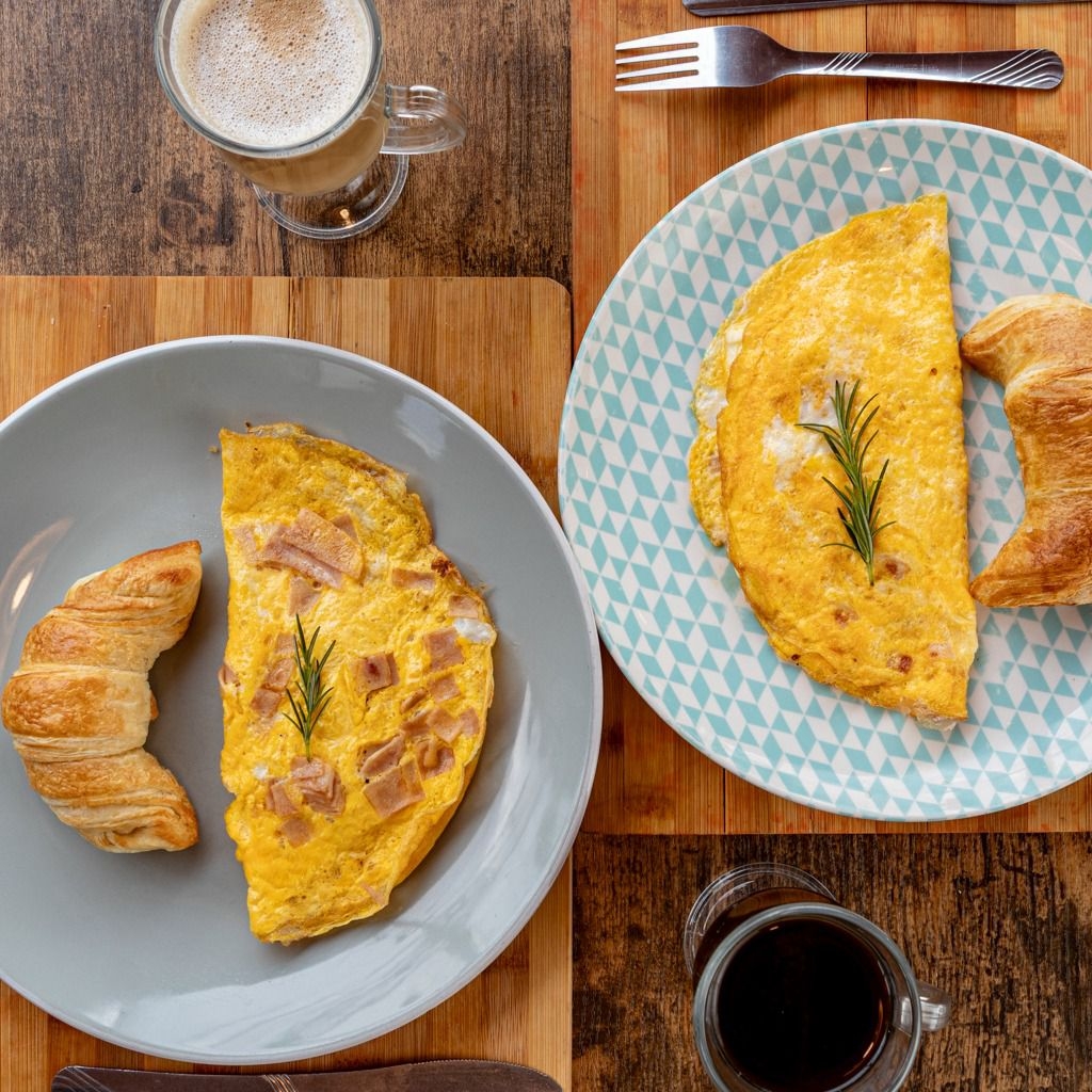 Omelette de jamón y queso, croissant y bebida a elección.