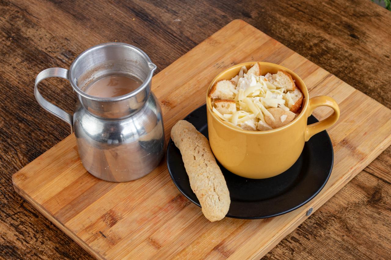Chocolate acompañado de migas de buñuelo, pandebono, palito de queso, queso cuajada, queso mozarella