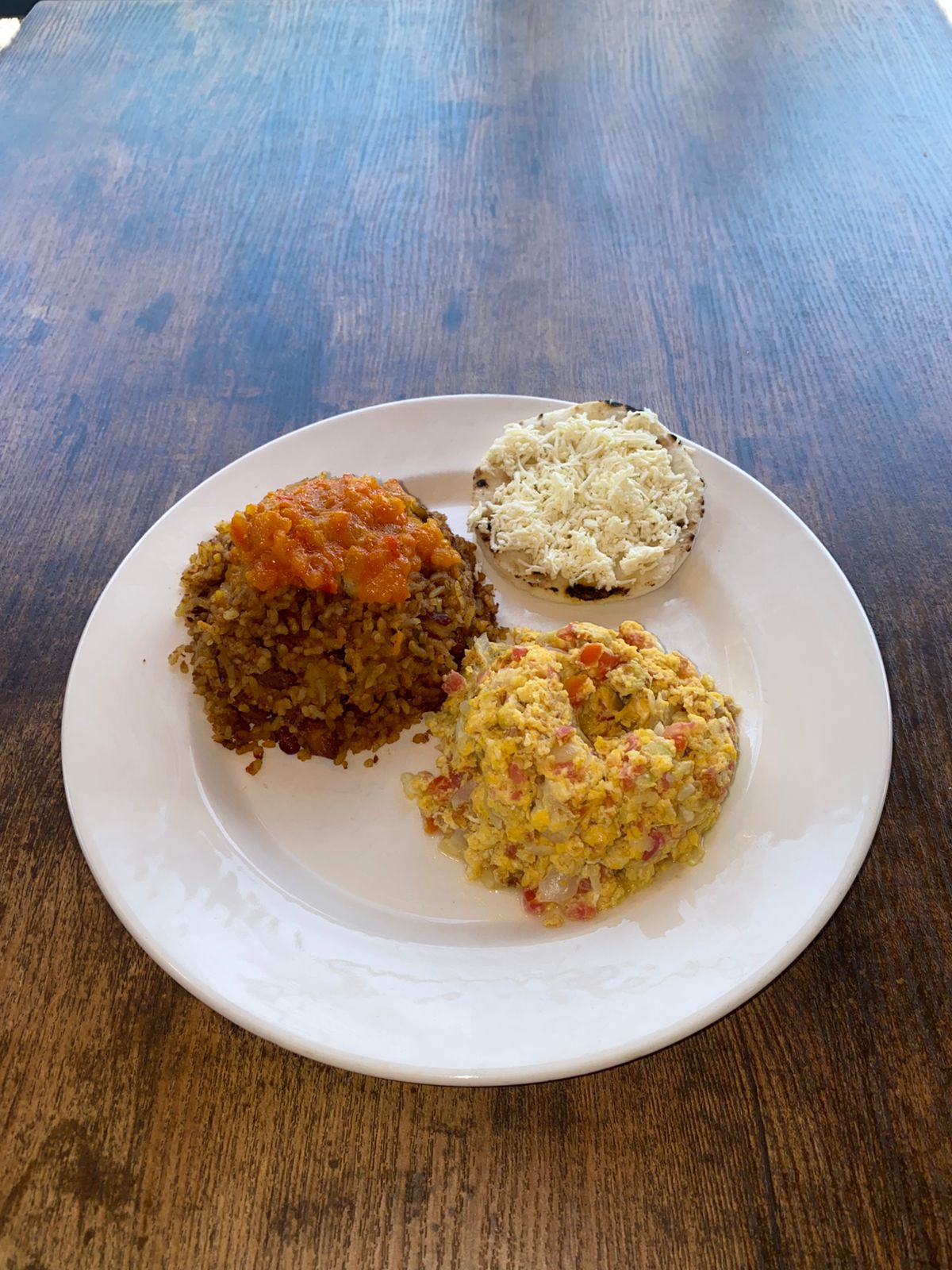Calentado de frijoles, huevos pericos, arepa con queso