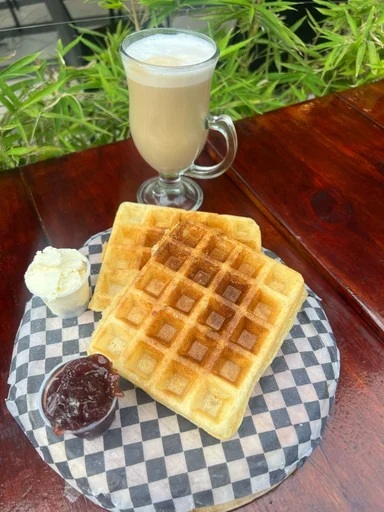 2 Waffles con masa de pandebono, queso crema y mermelada de mora. Acompañado de una bebida a elección.