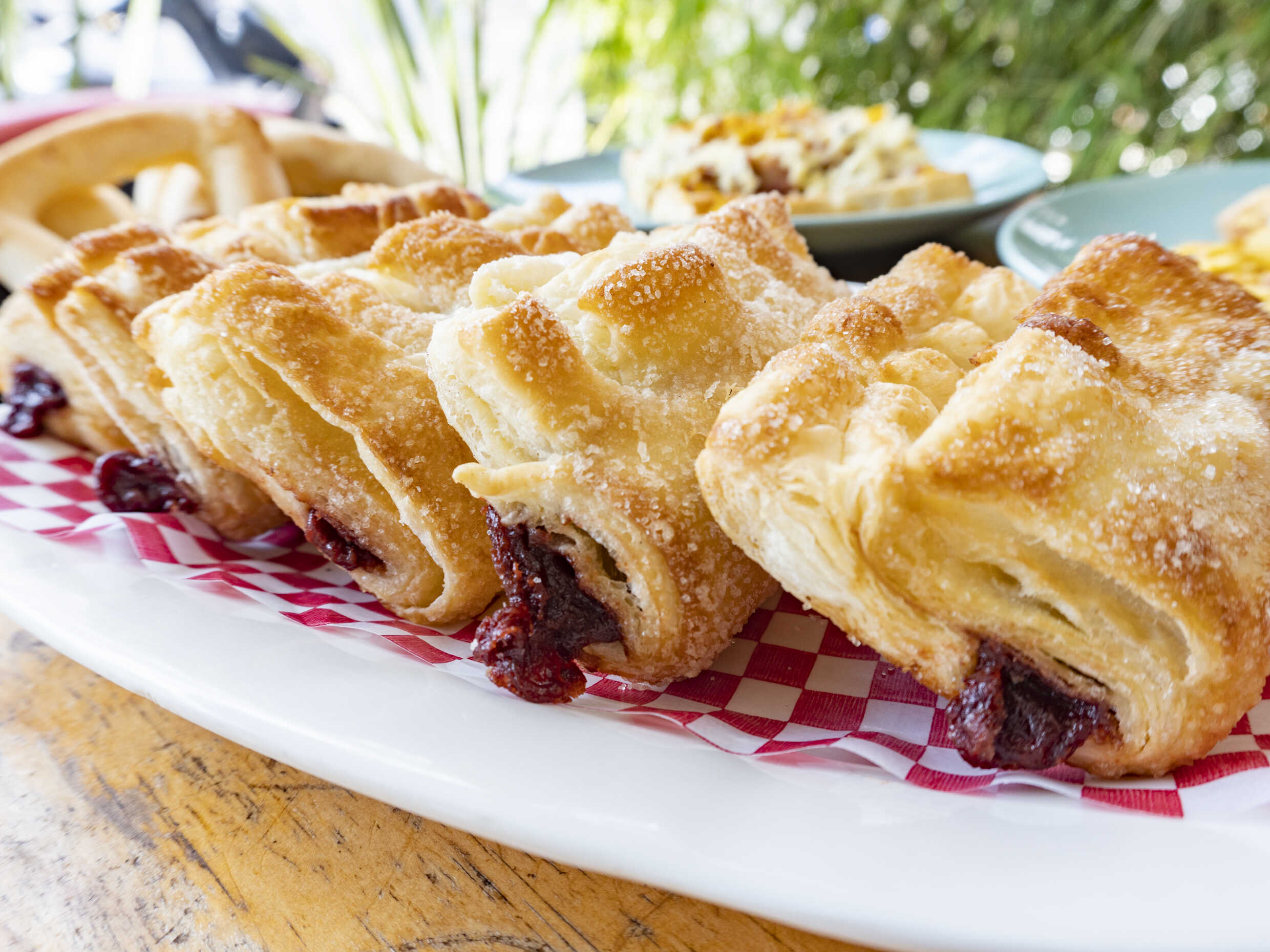Dos waffles de masa de pan de bono, mermelada y queso crema.