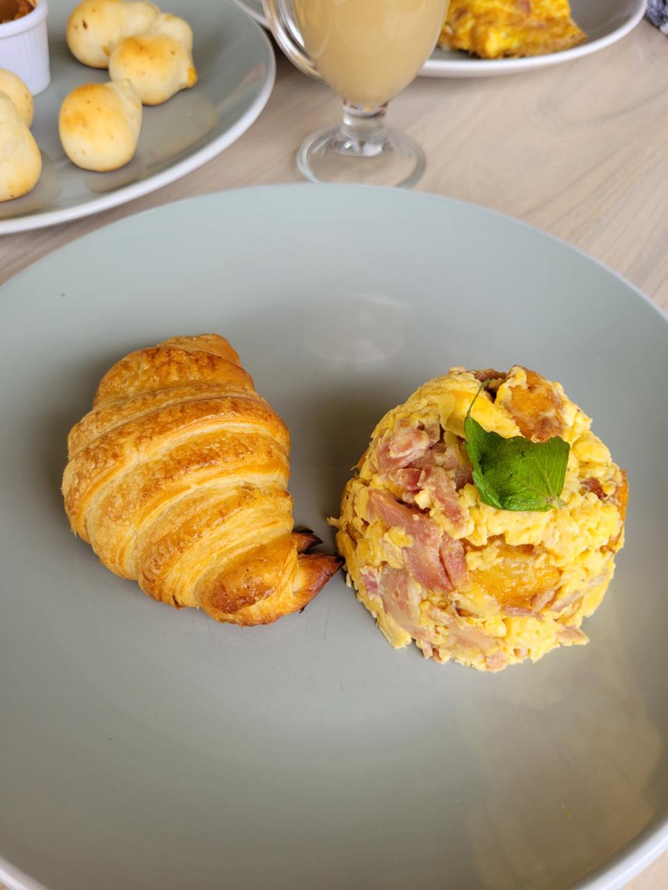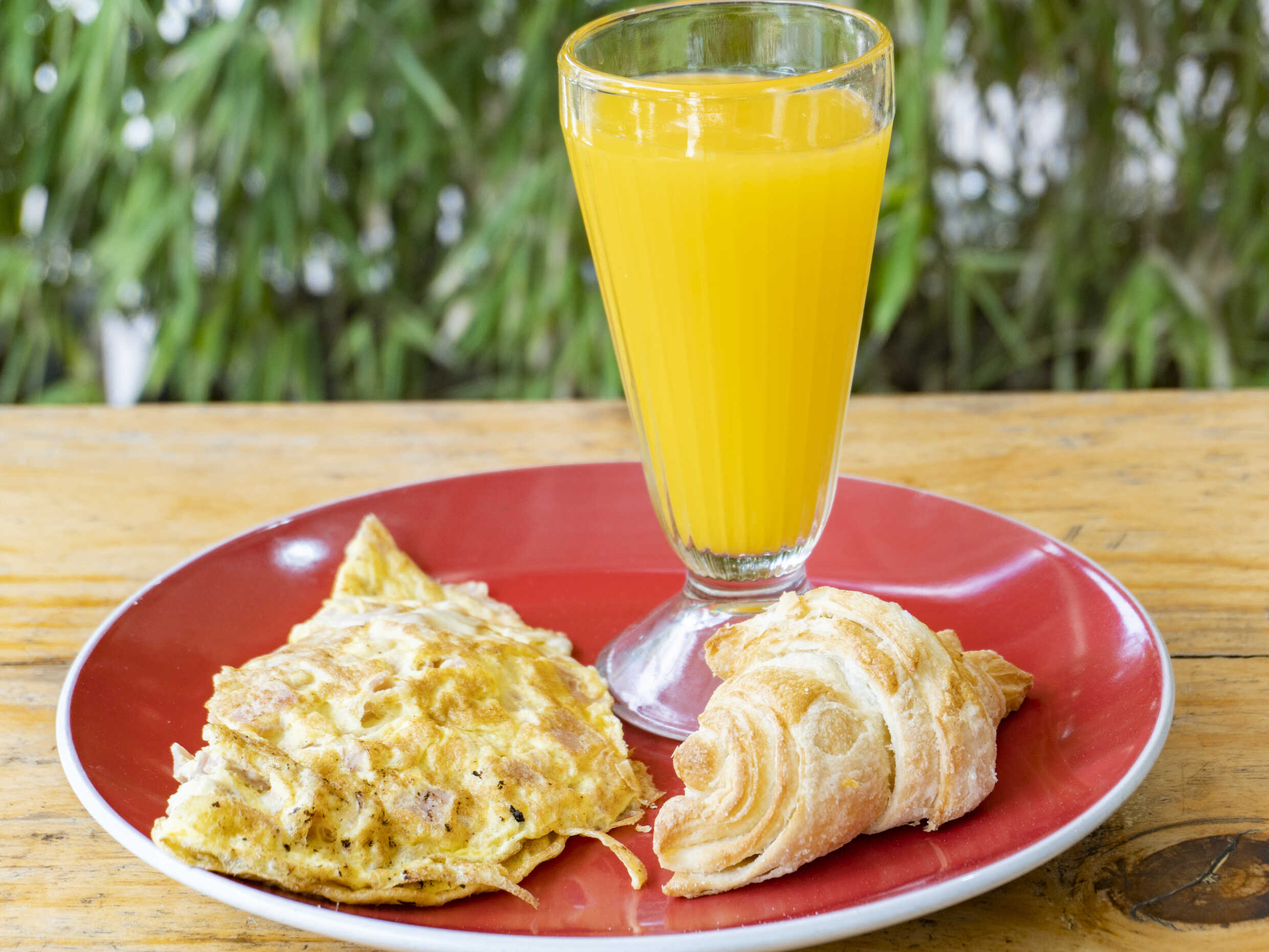 Omelette de jamón y queso, croissant y bebida a elección.