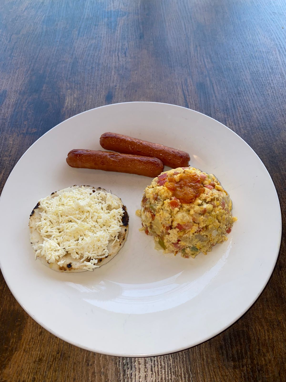 Huevos pericos, 2 salchichas llaneras, arepa con queso