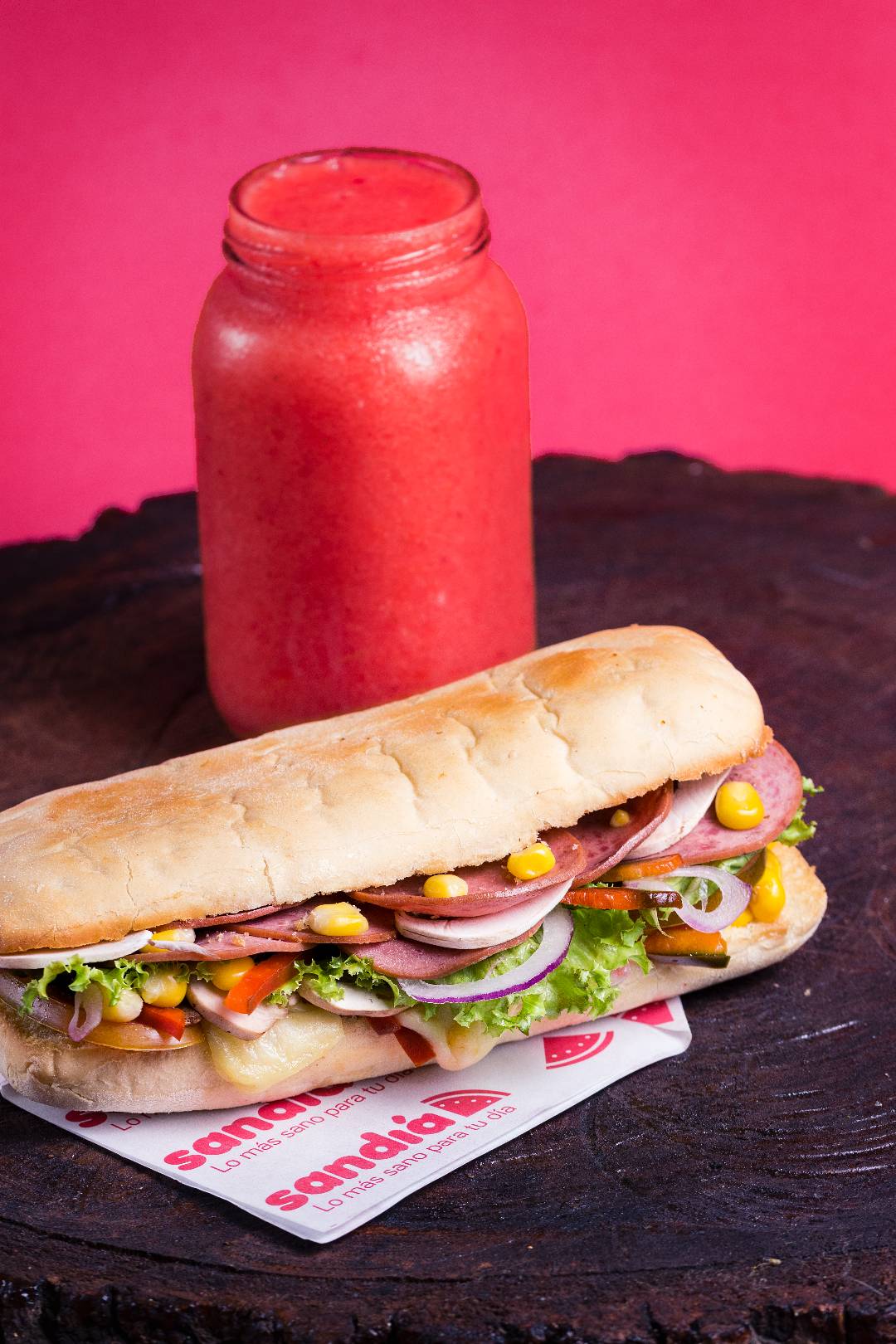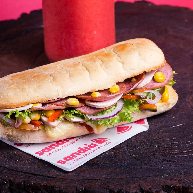 Delicioso sándwich acompañado de cebolla, tomate, maíz, champiñones, pimentón, lechuga, queso doble crema, salami, aceite de oliva y miel mostaza.