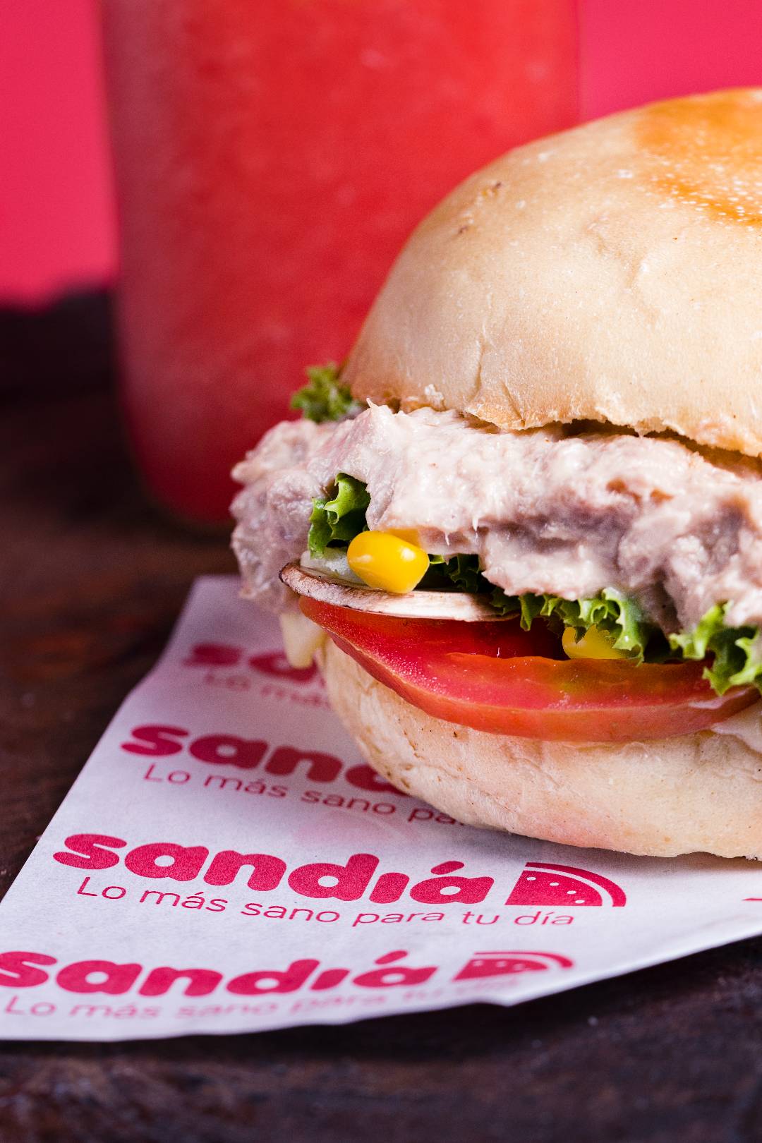Delicioso sándwich acompañado de cebolla, tomate, maíz, champiñones, pimentón, lechuga, queso doble crema, atún, aceite de oliva y miel mostaza.