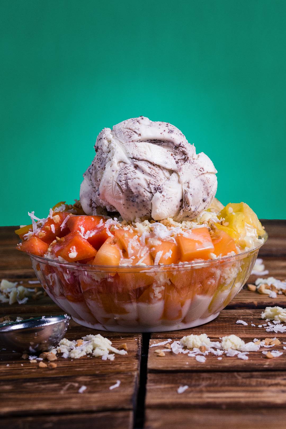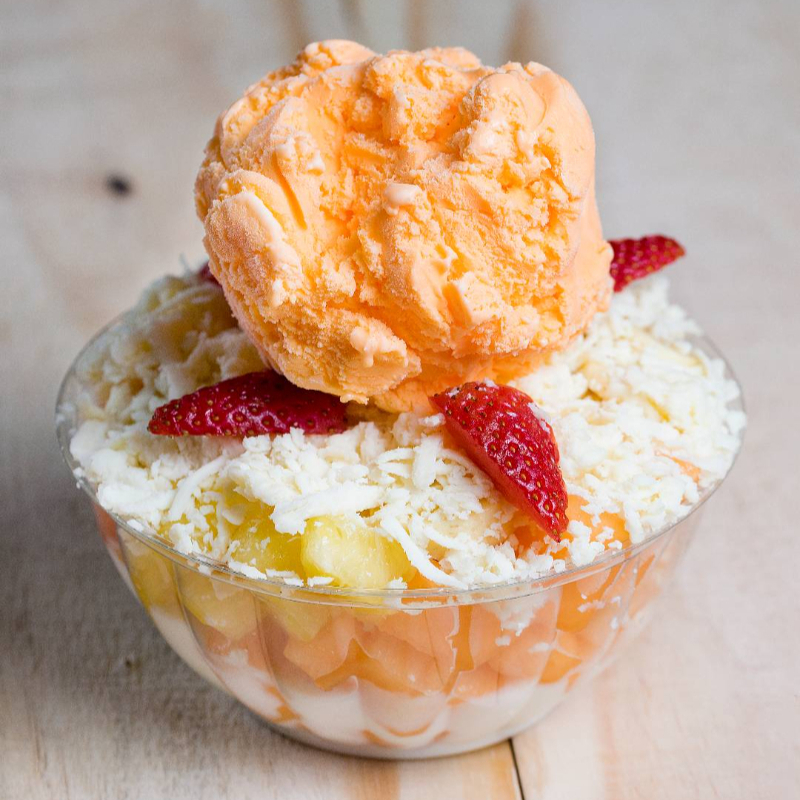 Deliciosa ensalada de banano, piña, uvas, papaya, mango, queso, 2 bolas de helado, lechera, salsa de mora.
