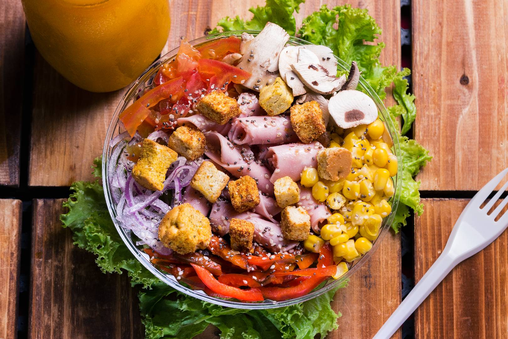 Delicioso sándwich acompañado de cebolla, tomate, maíz, champiñones, pimentón, lechuga, queso doble crema, pollo, aceite de oliva y miel mostaza.