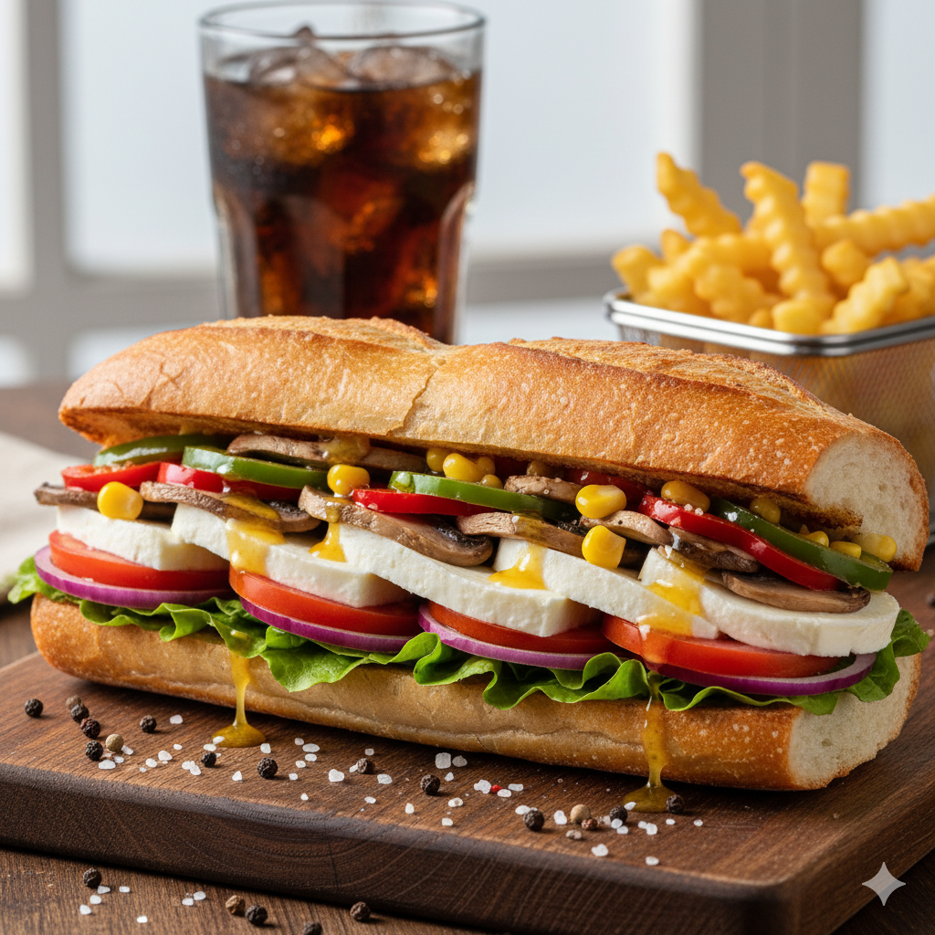 Delicioso sándwich acompañado de cebolla, tomate, maíz, champiñones, pimentón, lechuga, queso doble crema, aceite de oliva y miel mostaza.