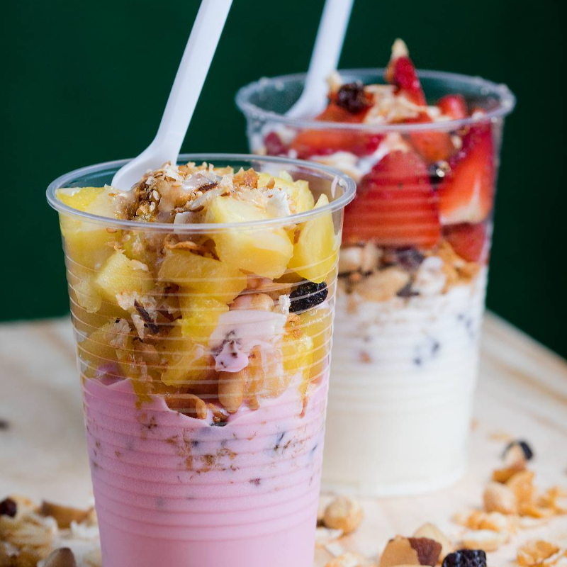 Delicioso parfait acompañado de fresa, banano, mango, papaya, granola, yogurt natural, lechera.