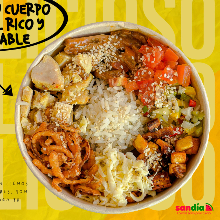 Delicioso bowl de arroz acompañado de 2 proteínas a elección, base a elección.
