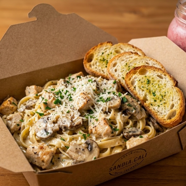 Nuestra pasta puede ser Pollo Jamon Vegetariana Desde $15000 sola $17000 con bebida Es una pasta larga en salsa cremosa de tomate o salsa blanca de champiñones Lleva una proteína a elección Pan francés Un poco de queso y Cebollin