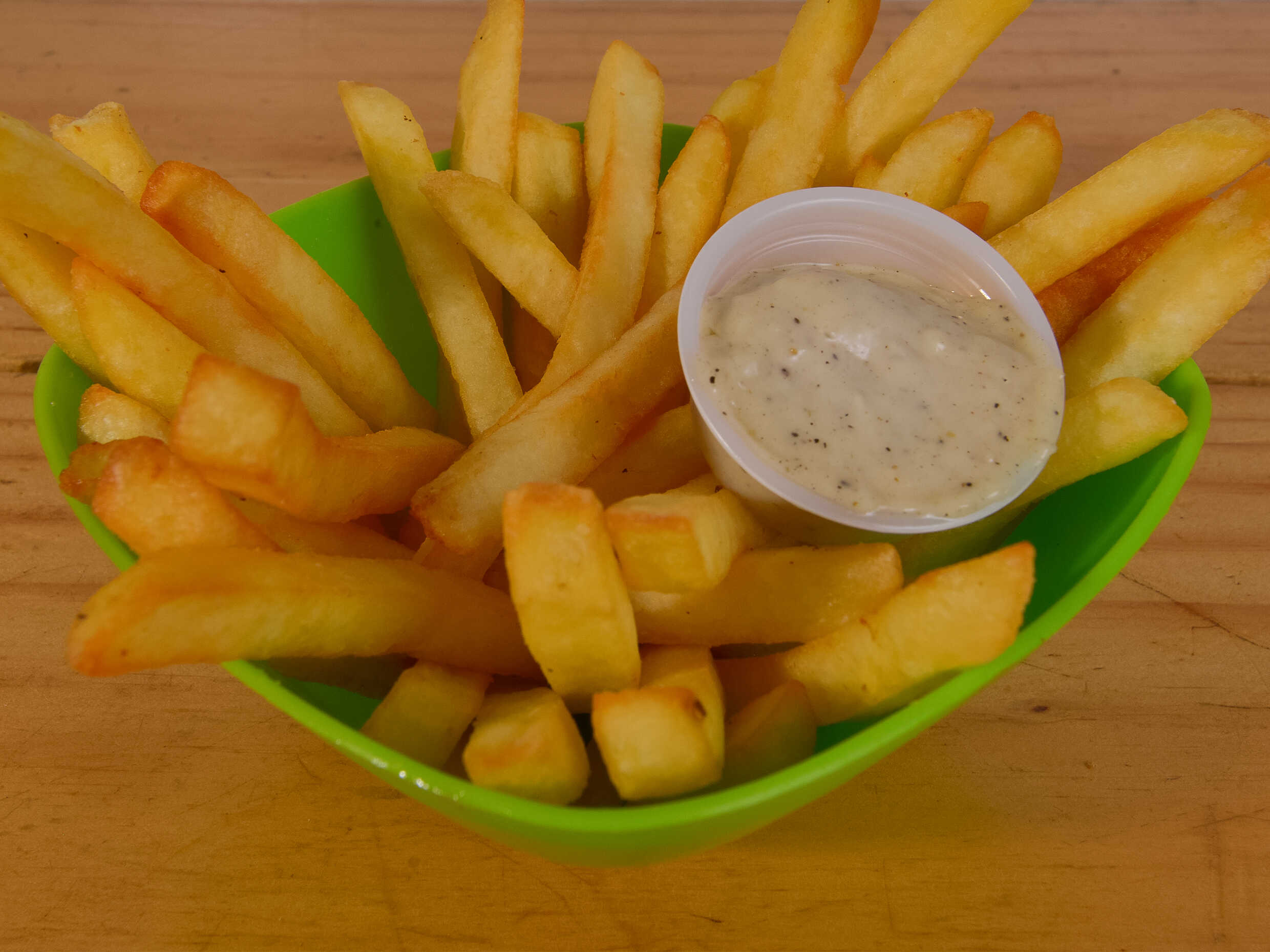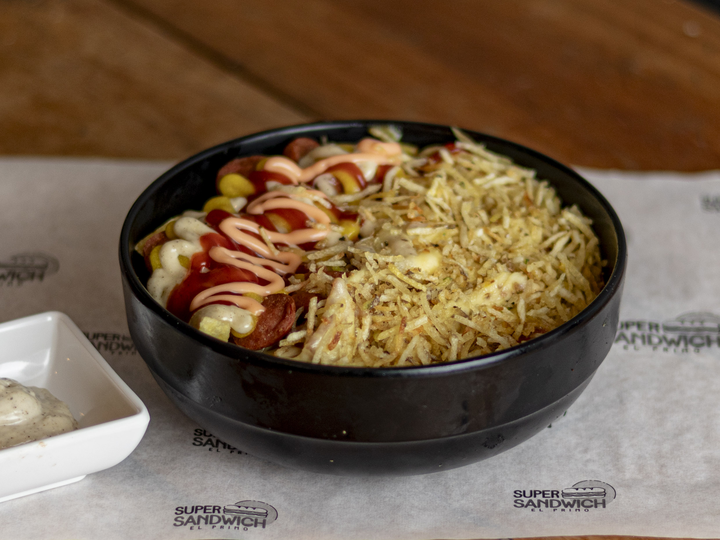 360g de papa a la francesa, salchicha americana, tocineta en trozos, queso gratinado y ripio.