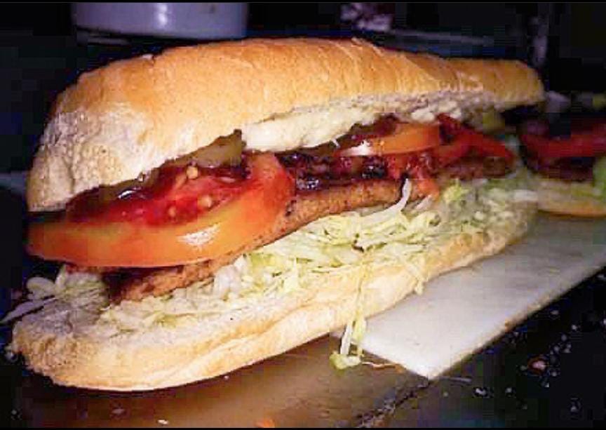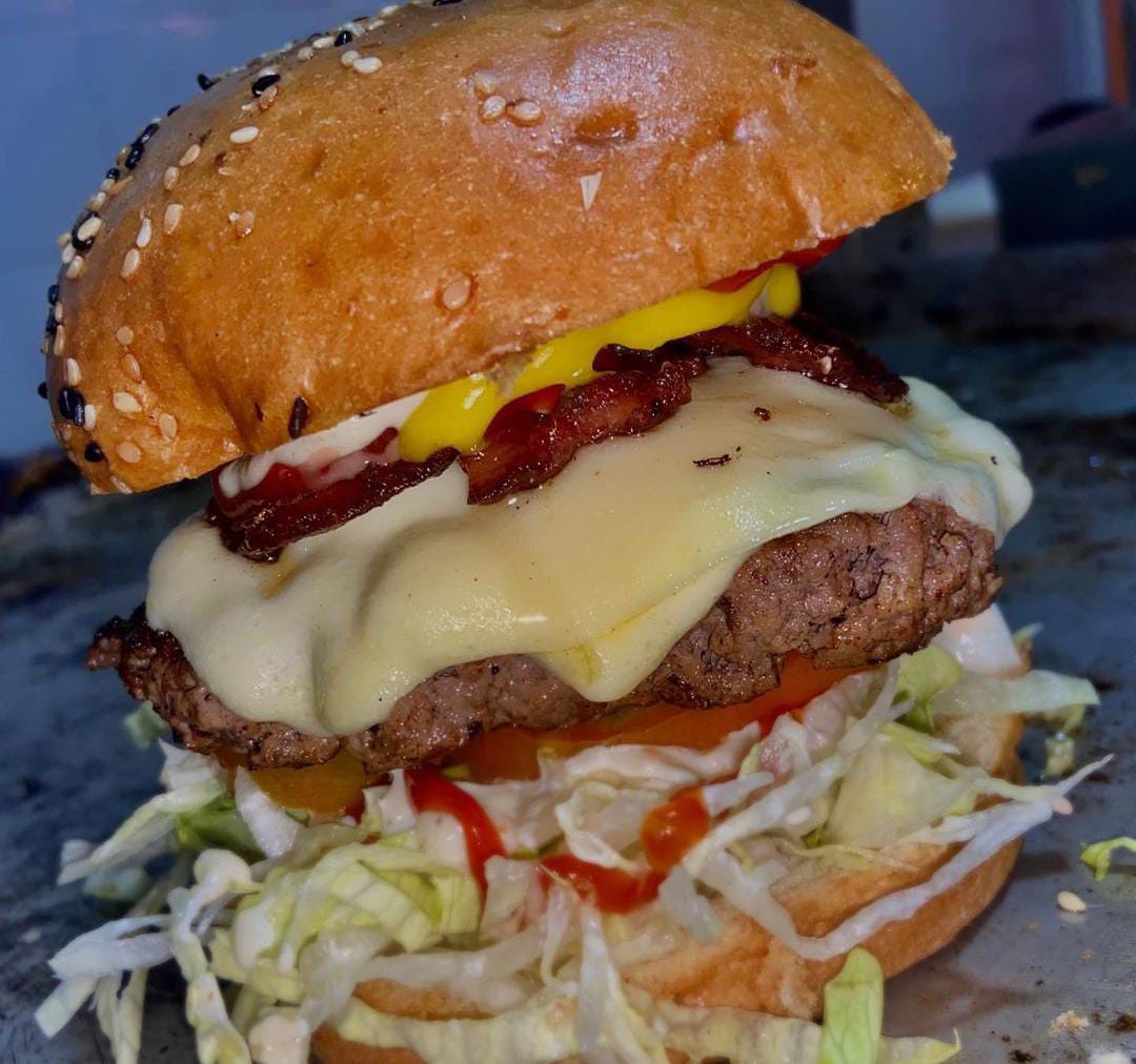 Carne de hamburguesa en trozs, tocineta, pepinillos, queso, tomate, salsa BBQ y salsa de ajo.