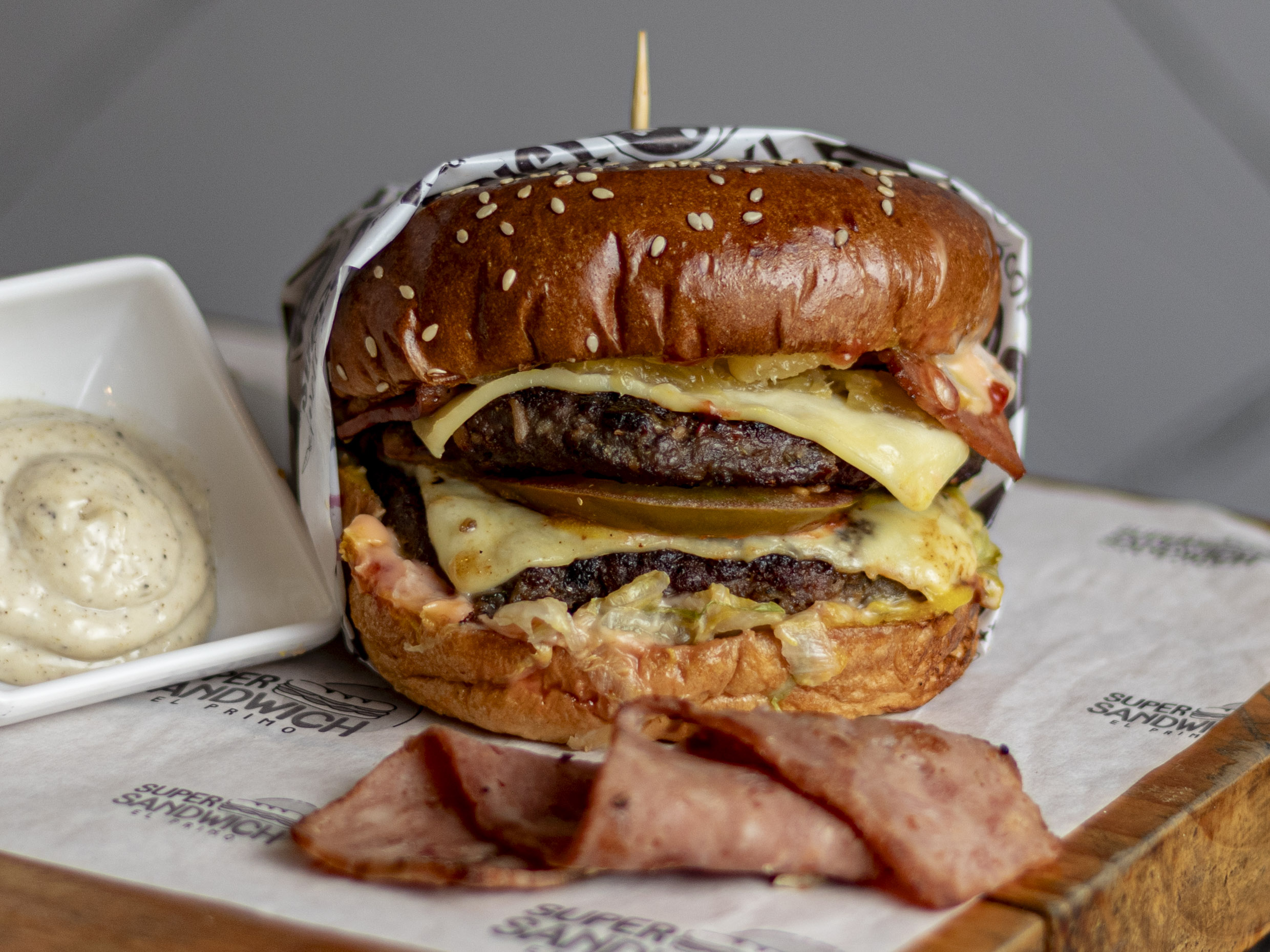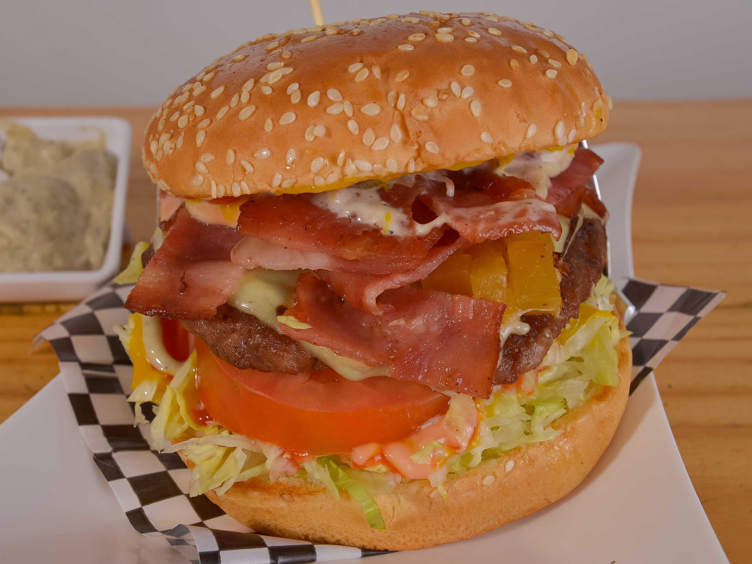 Doble carne de res, tocineta, lechuga, queso, tomate y cebolla.