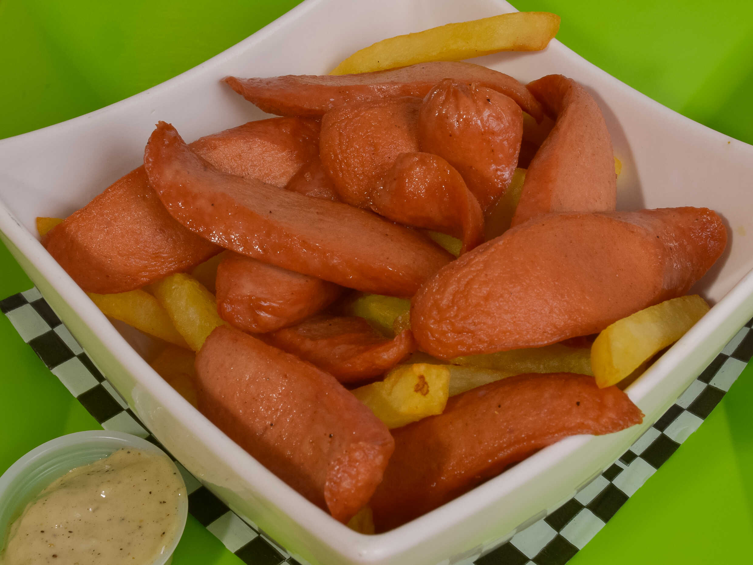 Papa a la francesa con salchicha americana.