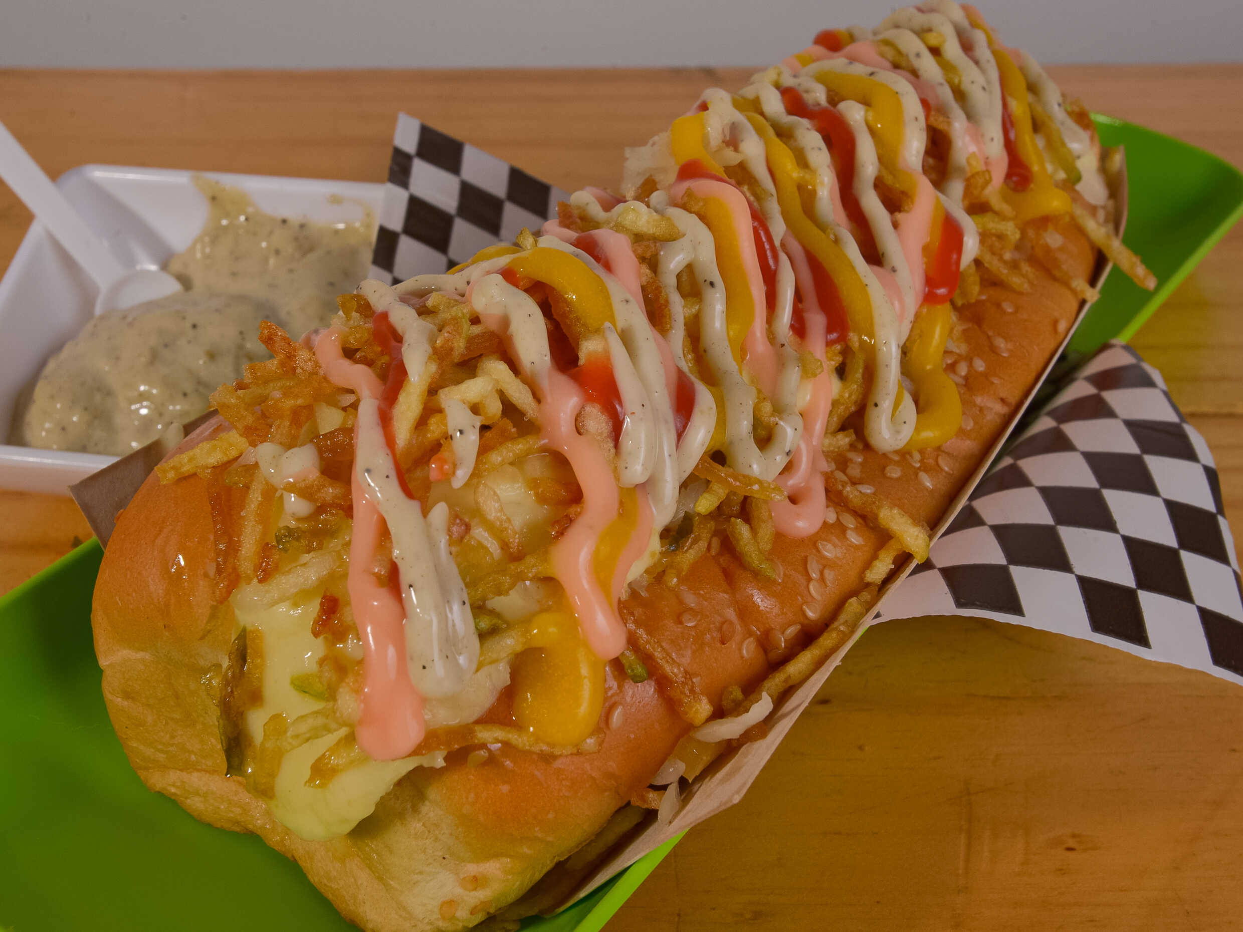 Salchicha vianesa, tocineta, piña, queso, cebolla y ripio.