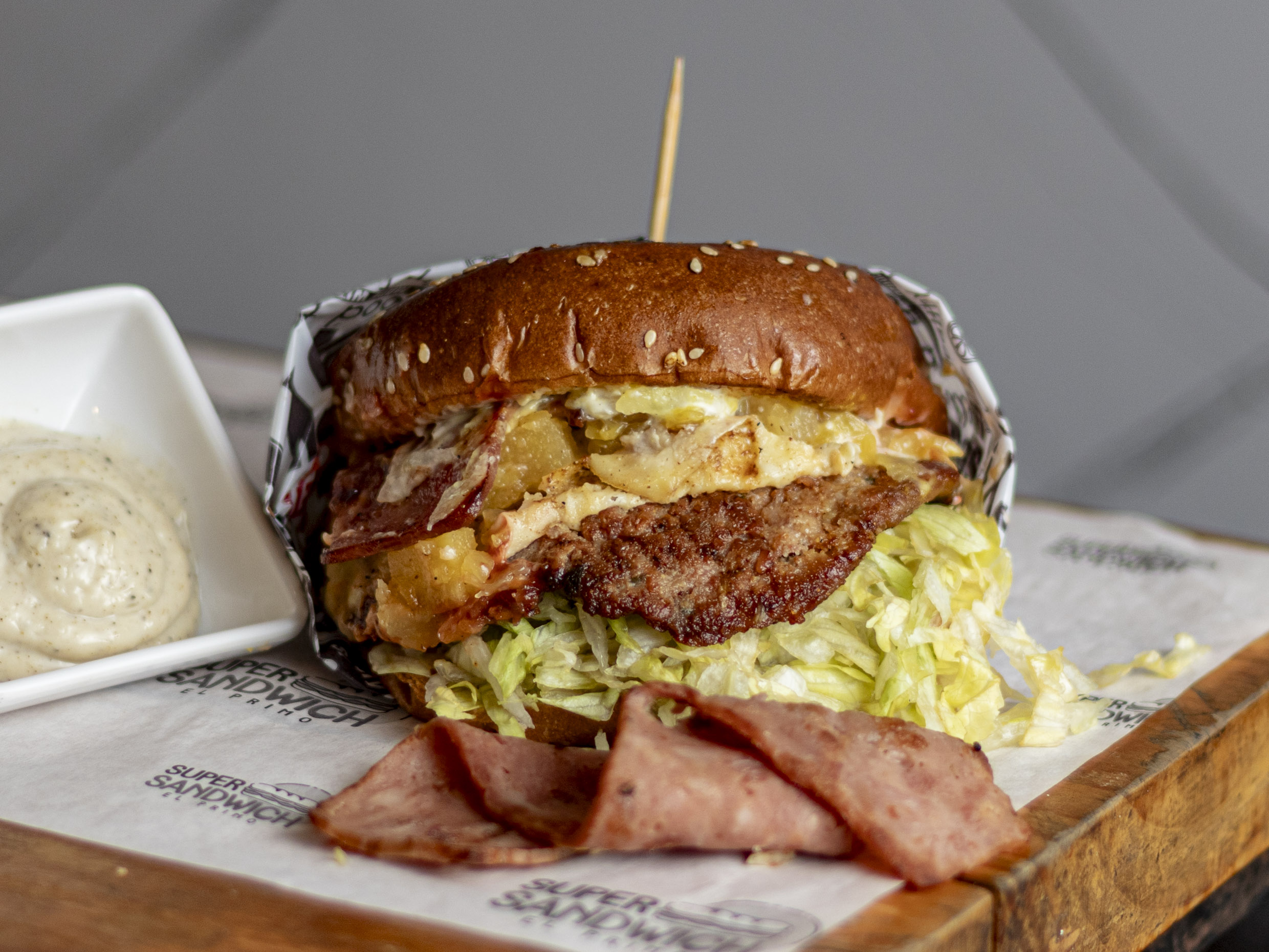 Jamón, jamonada, jamón de cordero, queso, lechuga y salsa de ajo.