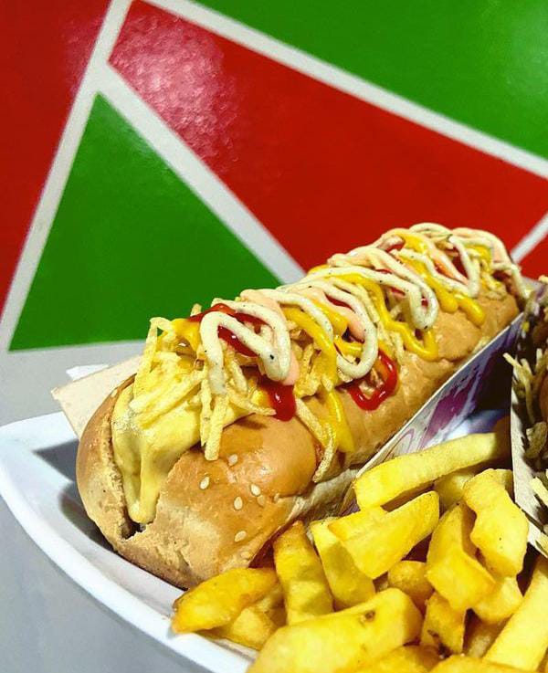 Salchicha americana, cebolla, piña, queso y ripio.