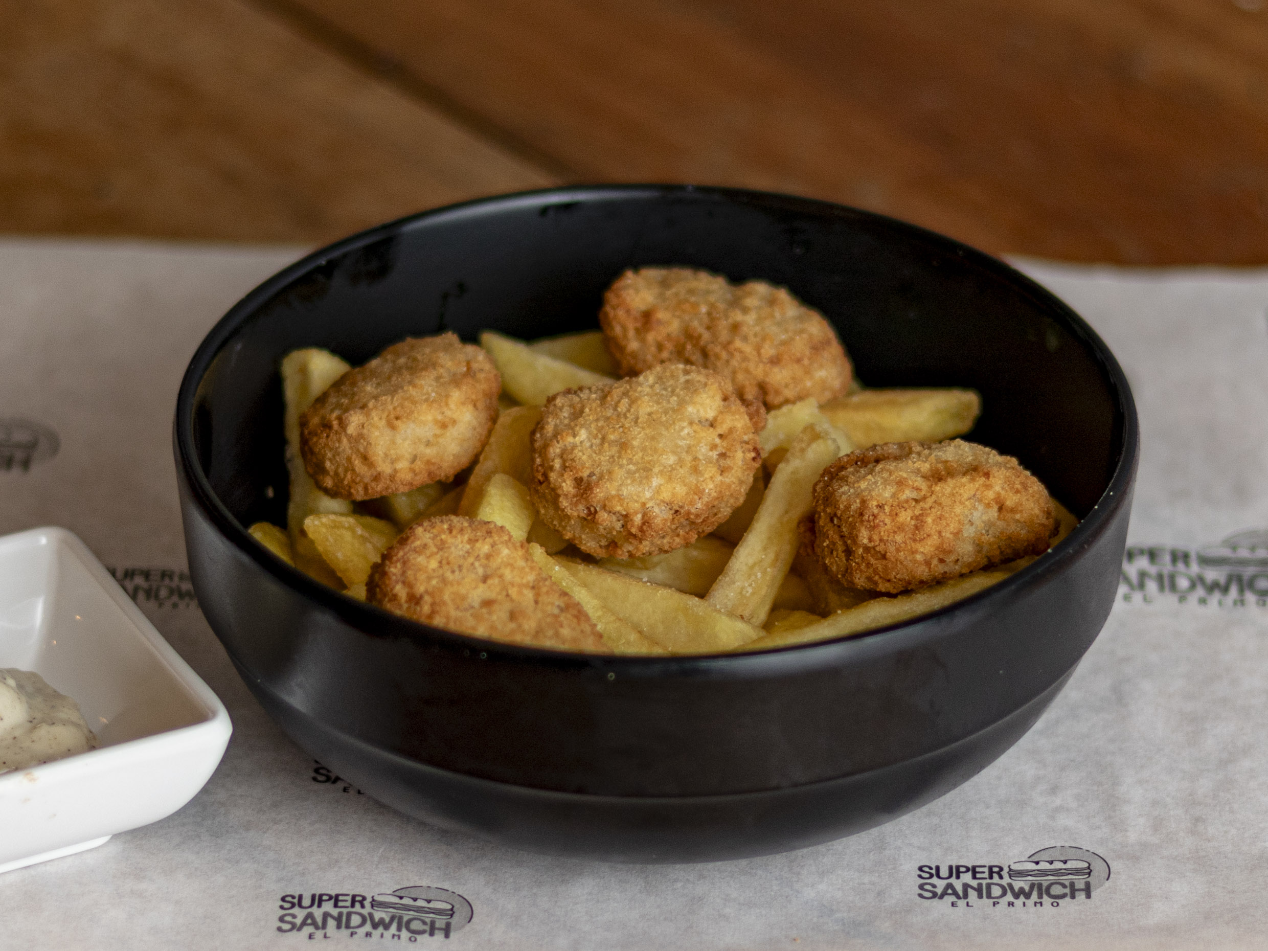 Papa a la francesa con 5 nuggets de pollo.