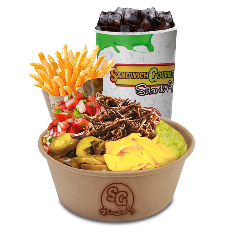 Sandwich de 38cm (jugosa Carne Desmechada, Chorizo, Chicharrón, Lechuga, Queso Mozarella, Madurito y Salsa de Ajo) + Papa Francesa 140gr + Pet400ml.