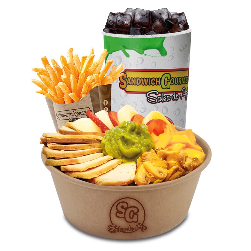 Ensalada Gourmet (lechuga, Huevo Duro, Jamón, Trozos de Filete de Pechuga, Queso Holandés, Arvejas, Maíz Tierno, Salsa Showy y Queso Parmesano) + Papas 140gr + Pet400ml.