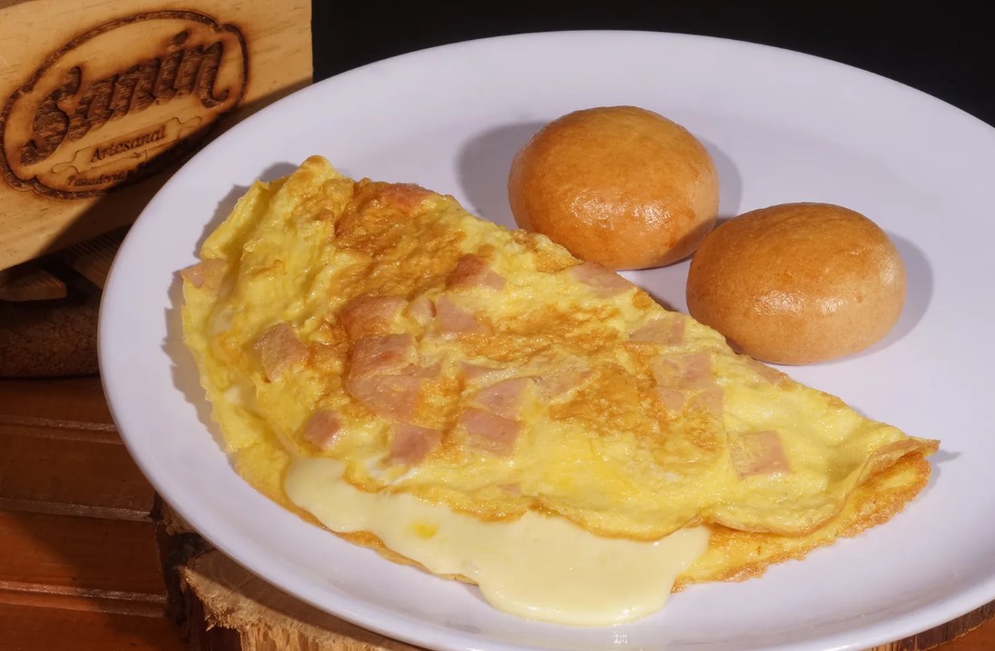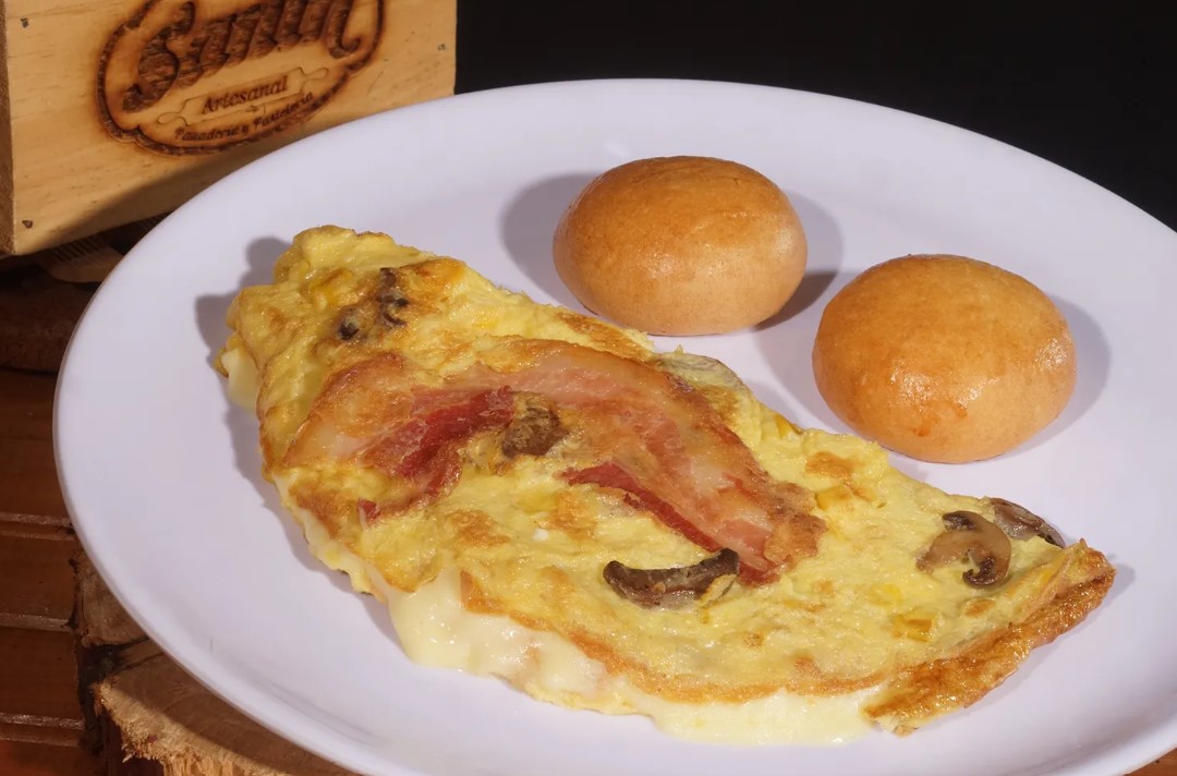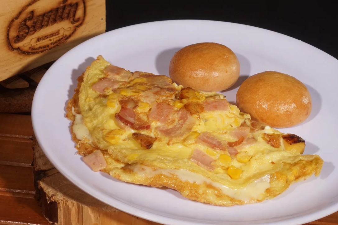 Omelette con maicitos, jamón, tocineta y queso.