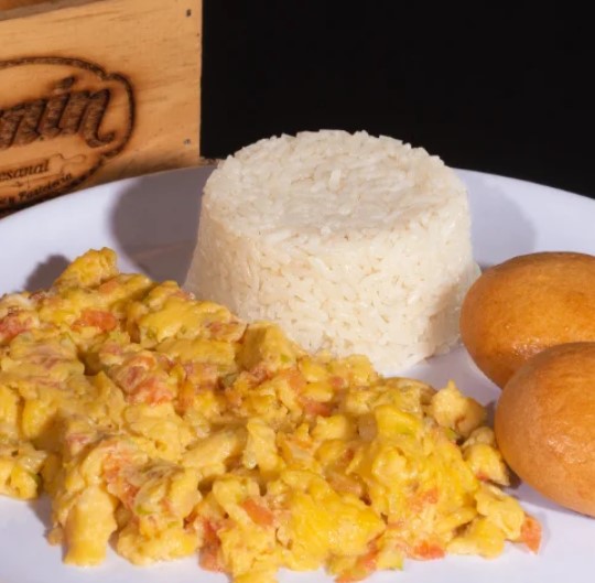 Huevos pericos, arroz y pan.