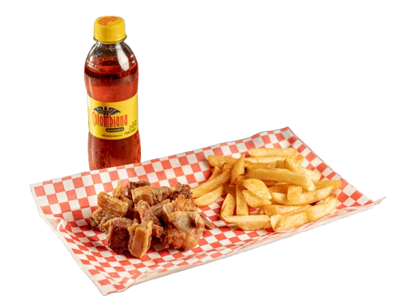 Combo Chicharon 200 Gr, acompañado de papas a la Francesa y Gaseosa PET 250 a tu elección .