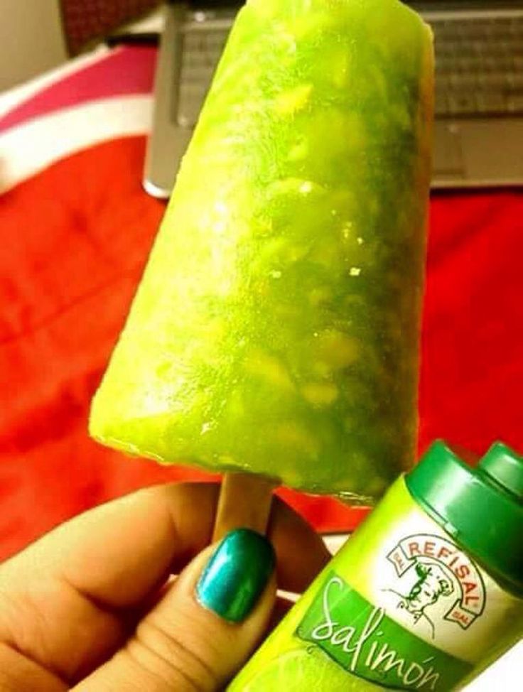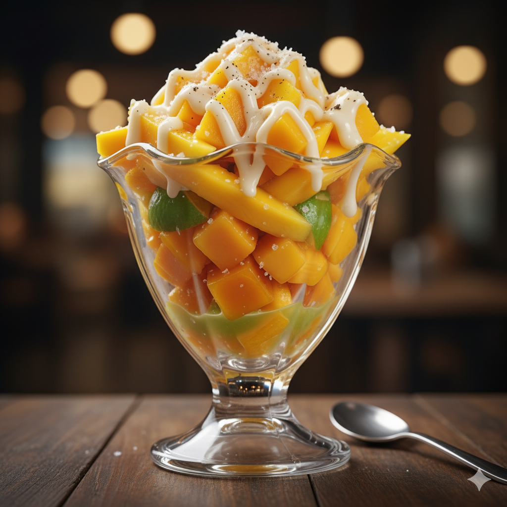 Granizado de pulpa de mango viche, sal, limón, lechera y trocitos de mango.