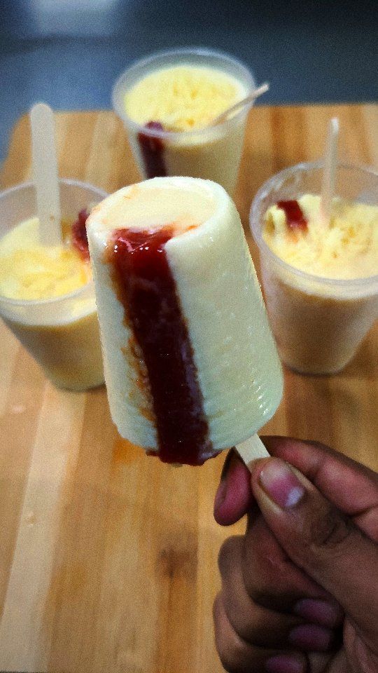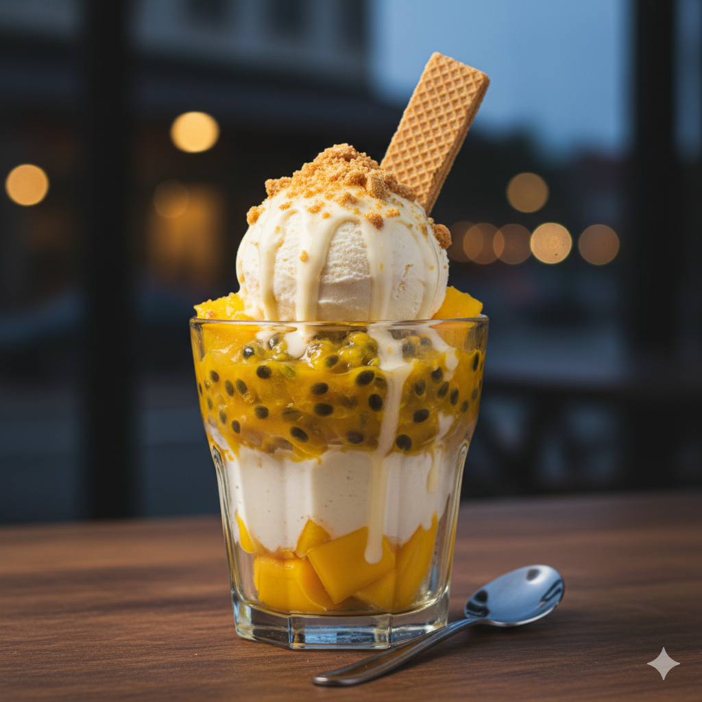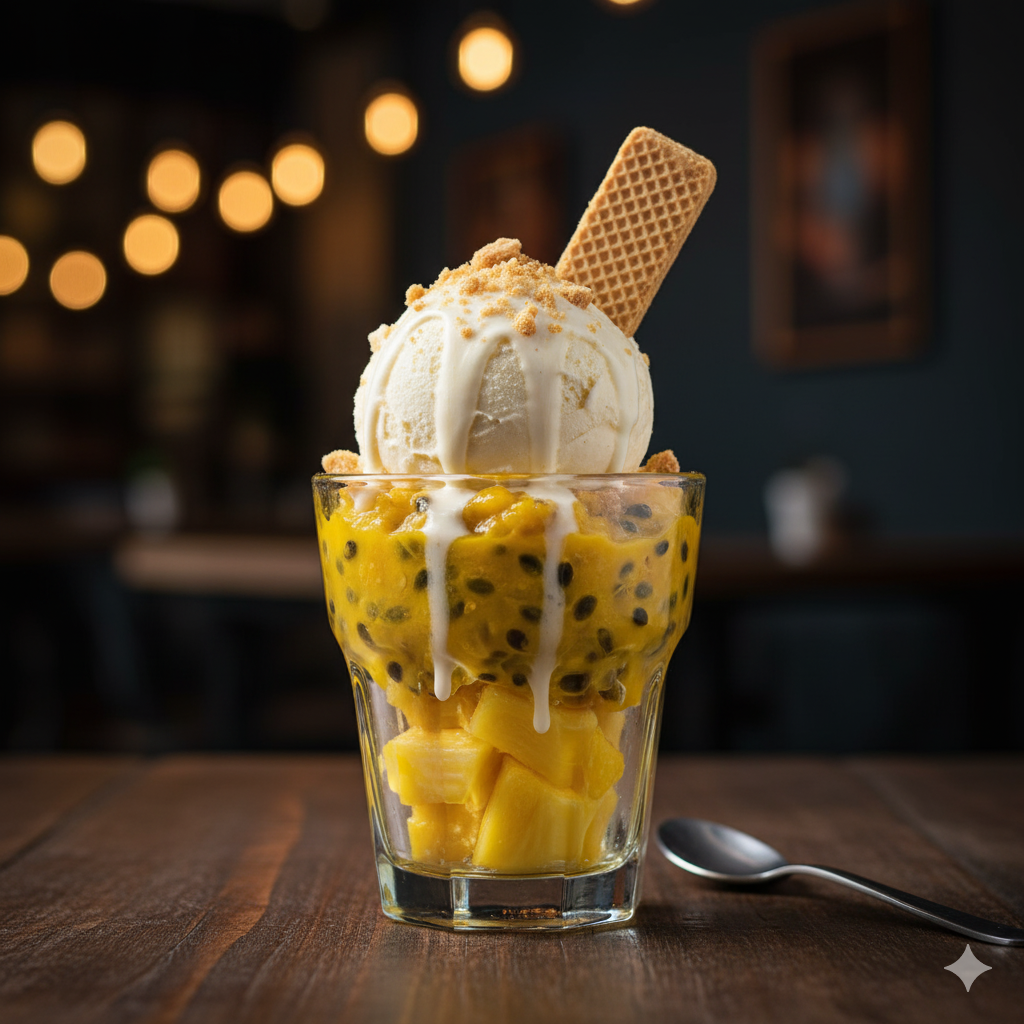 Mango, maracuyá, helado de vainilla, lechera de la casa y galletas.