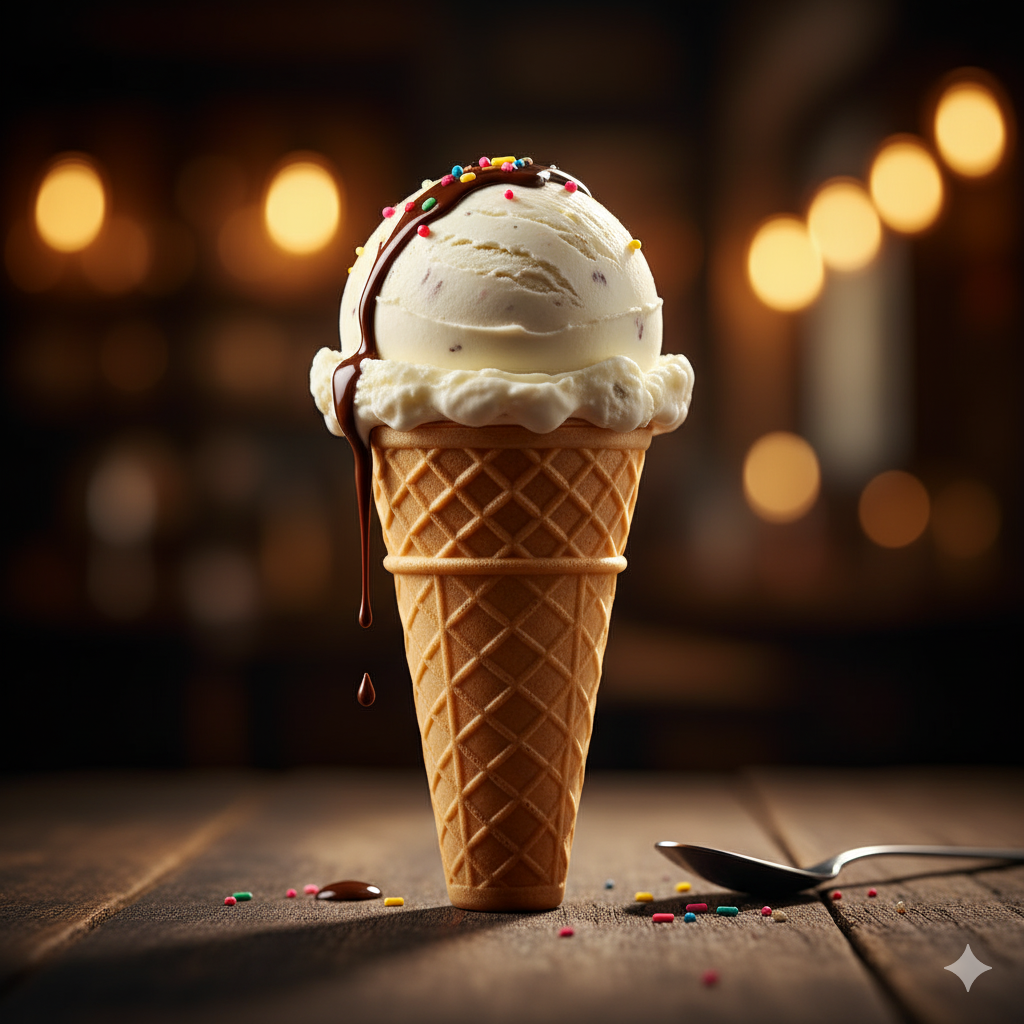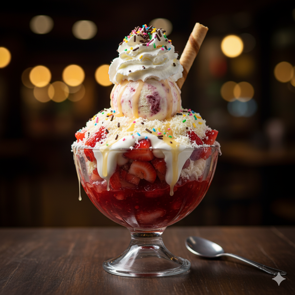 2 bolas de helado a elección, salsa de fresa y lluvia de chocolate.