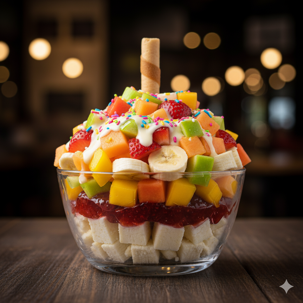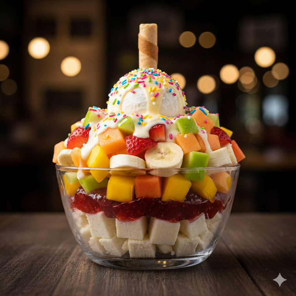 Ensalada de banano, fresa, piña, mango, papaya, queso, crema de la casa y 1 bola de helado.