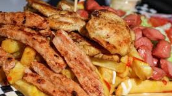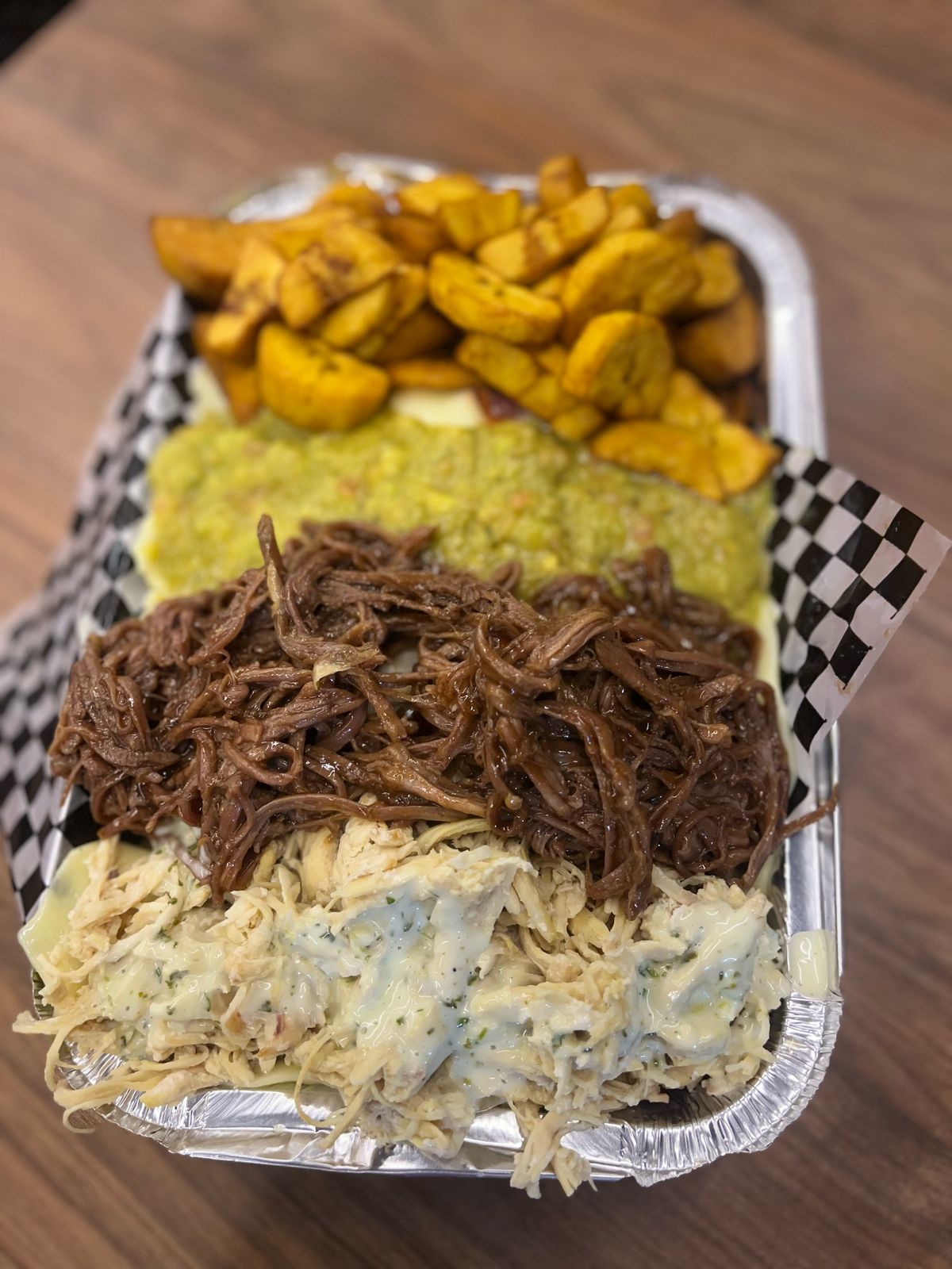 Papa a la francesa, yuca, lechuga, tomate, maduro, chorizo, pollo, res y costilla.